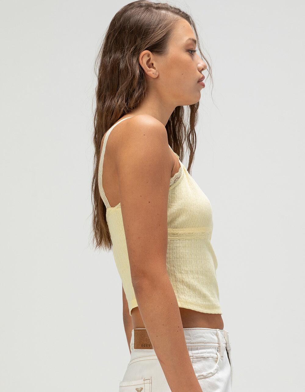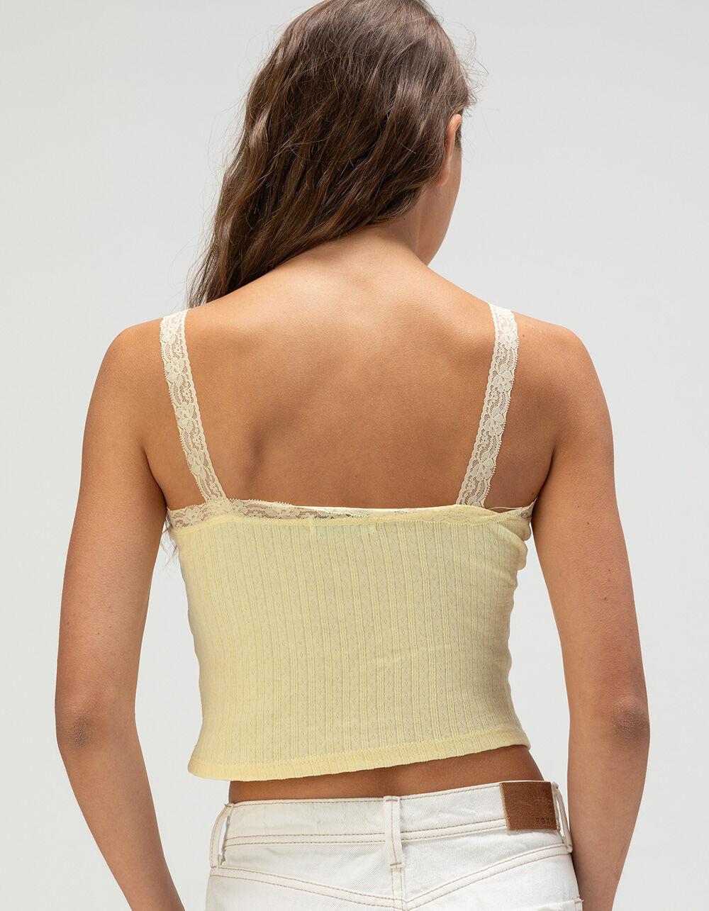 RSQ Lace Trim Cami. The RSQ Lace Trim Cami adds a touch of elegance to your everyday look. Crafted from soft pointelle fabric, this sleeveless top features delicate lace trim along the neckline and lace straps for a feminine, detailed finish. A satin bow at the neckline adds a sweet, charming touch, making it perfect for layering or wearing on its own. Made from 100% cotton, this cami offers effortless style and comfort for any occasion. Machine wash. Imported.
