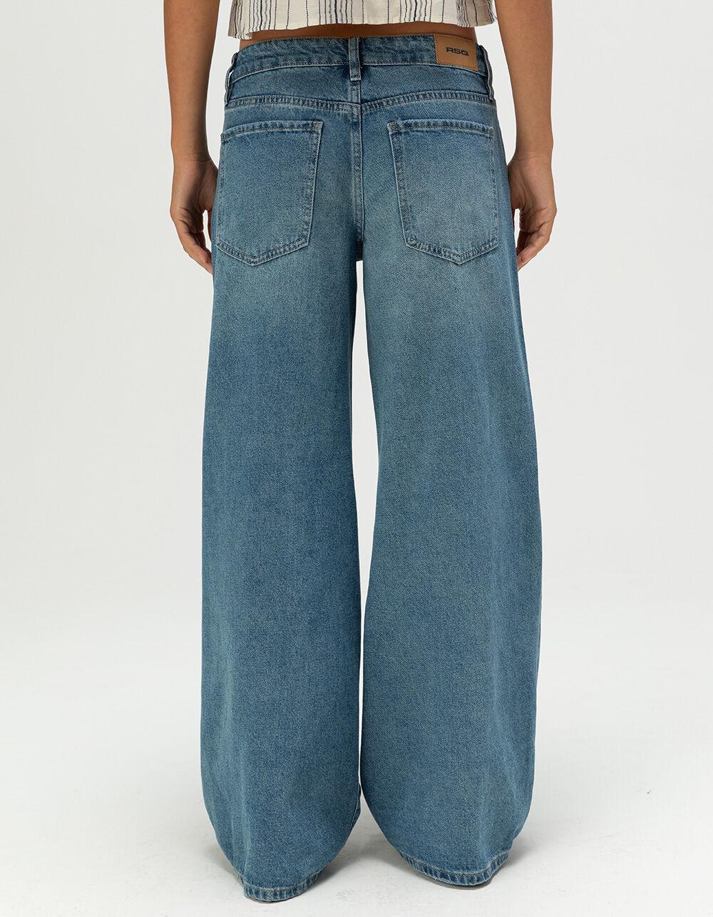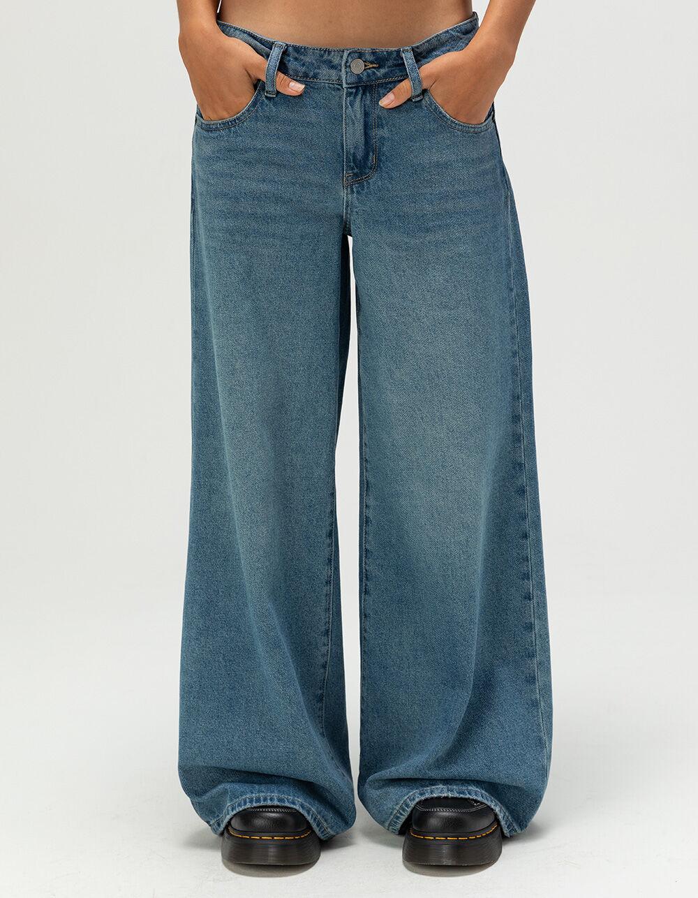 RSQ Low Rise Baggy Jeans. 5-pocket denim styling. Button closure with zip fly. Belt loop waist. Low rise. Baggy fit. Slight distressing at pockets and leg openings. Medium wash. Approximate leg opening: 26". 93% Cotton 4% Polyester 3% Rayon. Machine wash. Imported.
