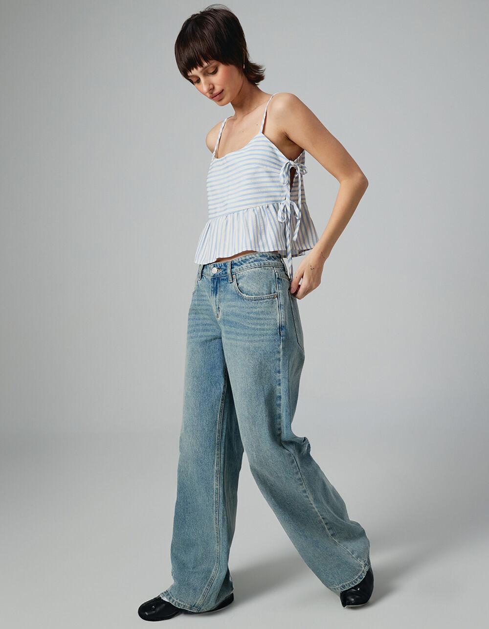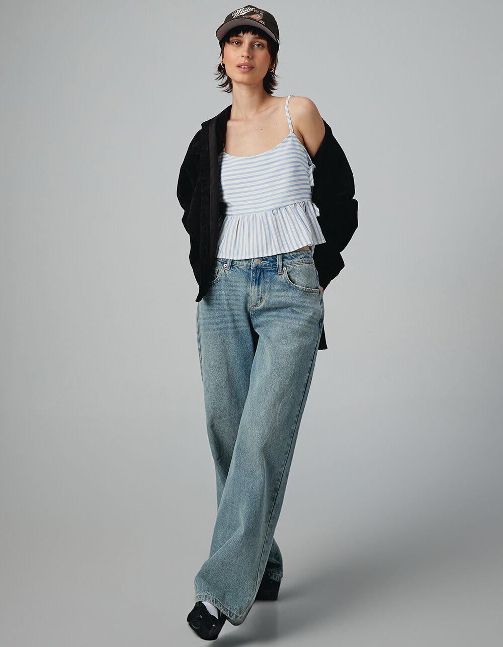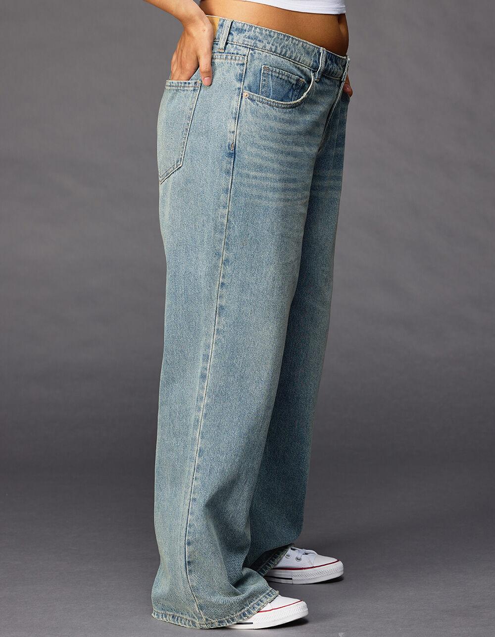 MEDIUM WASH. RSQ Low Rise Baggy Jeans. Slouchy but flattering fit. Rigid denim. Zip fly and button closure. Belt loop waist. Traditional five pocket styling. Medium wash. Front Rise: 9.5”. Inseam: 31.5''. 92% Cotton, 8% Rayon. Machine wash. Imported.