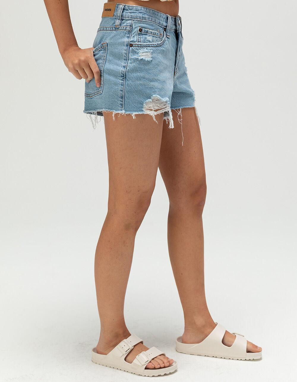 RSQ Mid Rise Vintage Shorts. Bring laid-back vibes to your look with the RSQ Mid Rise Vintage Shorts. These light wash denim shorts feature classic 5-pocket styling, a button closure with zipper fly, and a belt loop waist for that timeless jeans-inspired fit. Distressed rip details, raw edge hems, and subtle fraying at the pockets give them a perfectly worn-in feel, while the mid-rise waist offers a flattering, comfortable fit. With an approximate 2" inseam, they strike the right balance between casual and cool—perfect for everything from weekend errands to summer festivals. Front body: 100% Cotton. Back body: 97% Cotton 2% Other Fiber 1% Spandex. Machine wash. Imported.