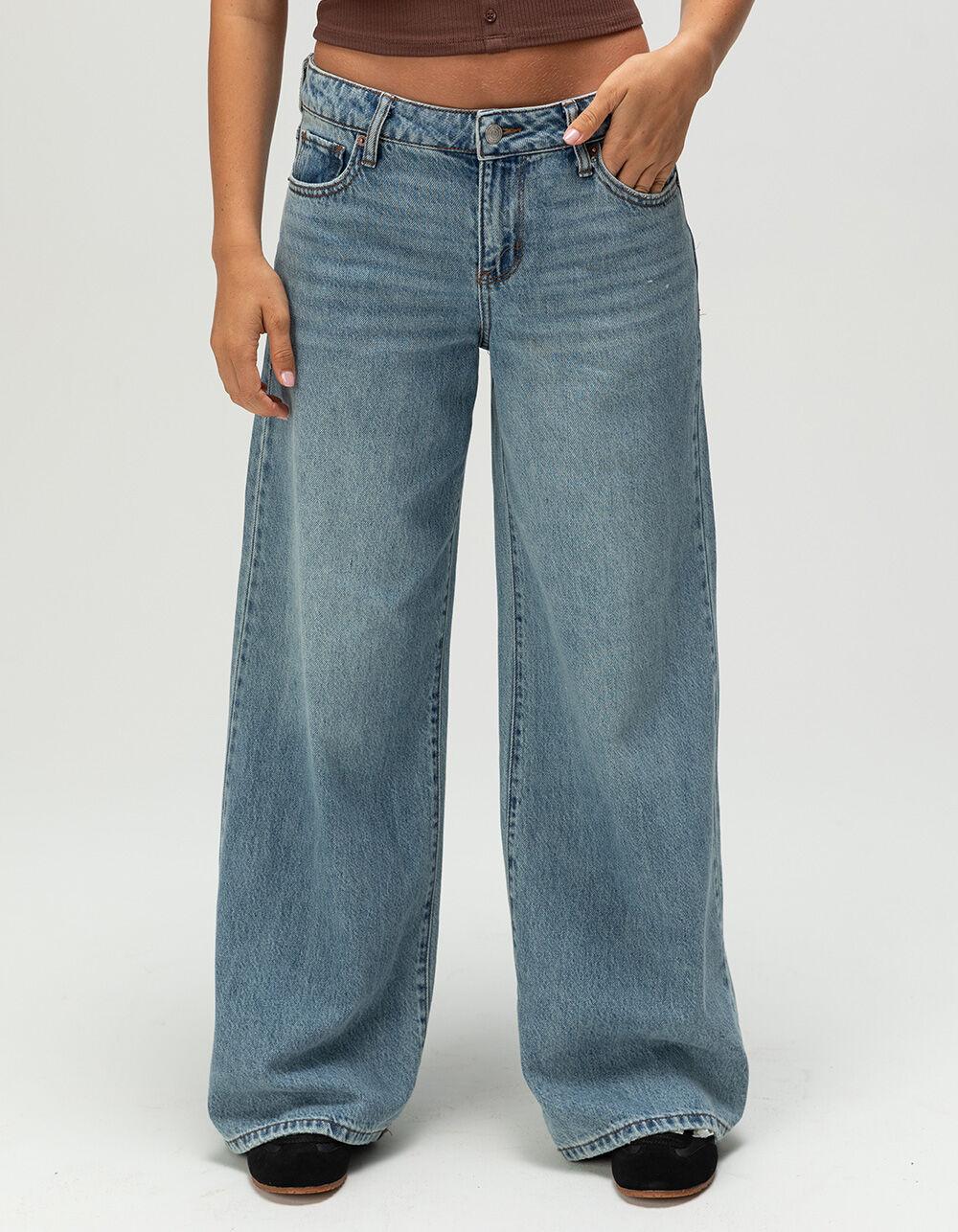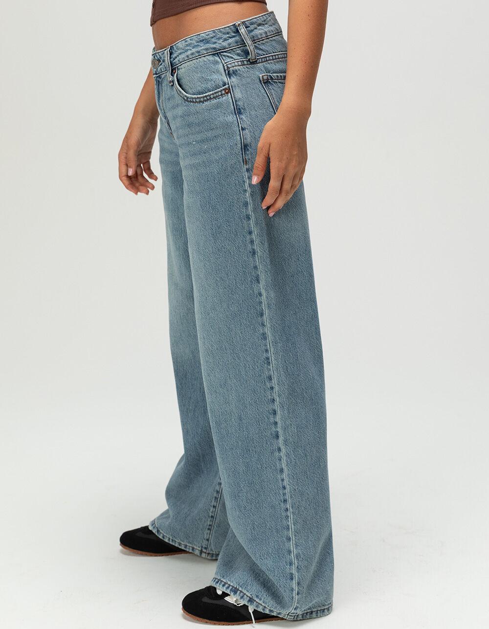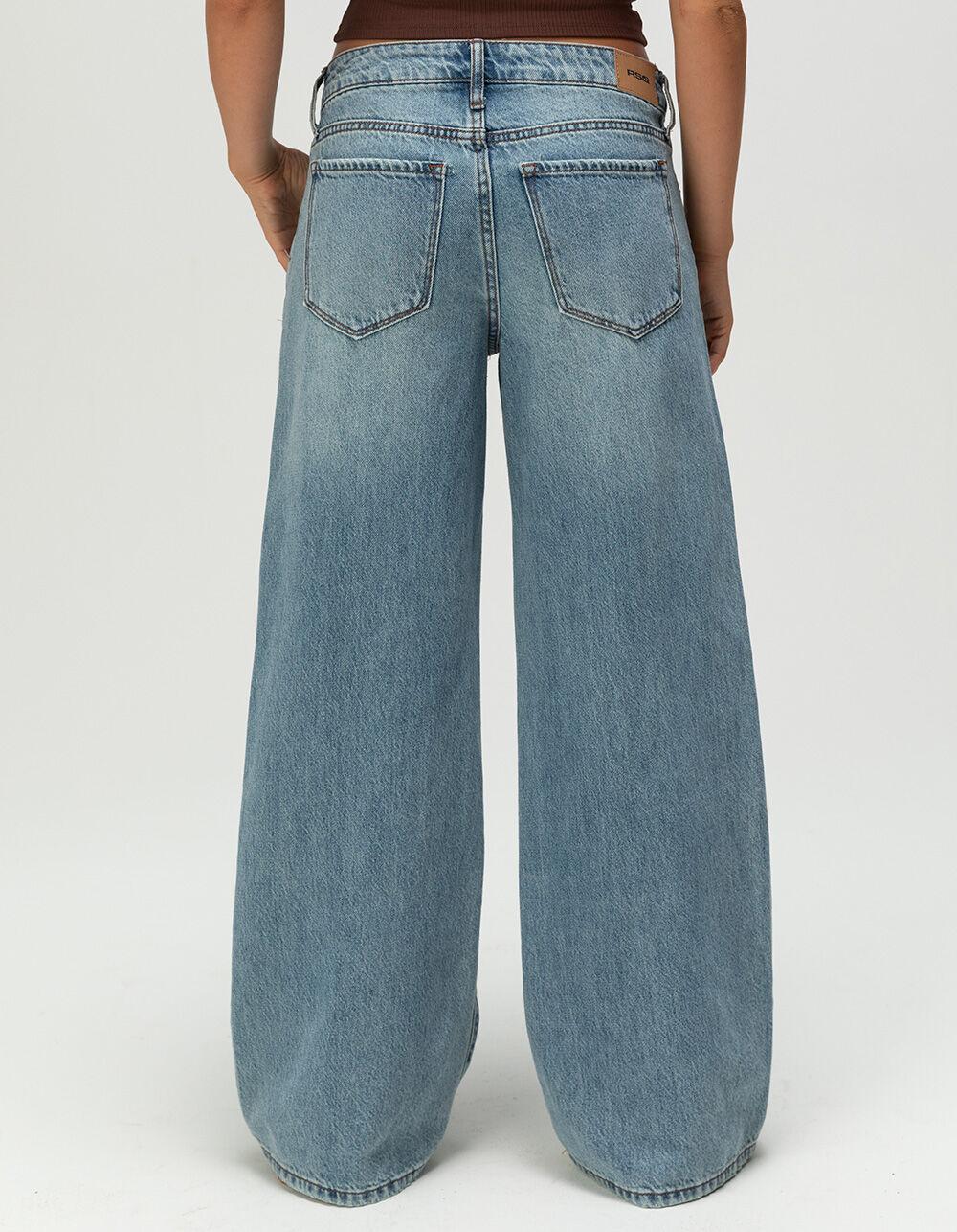RSQ Mid Rise Wide Leg Jeans. 5-pocket denim styling. Button closure with zipper fly. Belt loop waist. Slight fraying at leg openings and pockets. Light stone wash. Mid rise. Wide leg fit. Approximate leg opening: 20". 100% Cotton. Machine wash. Imported.