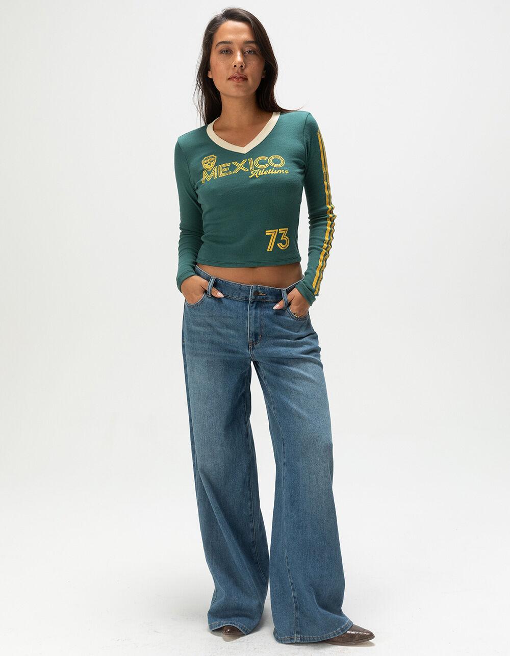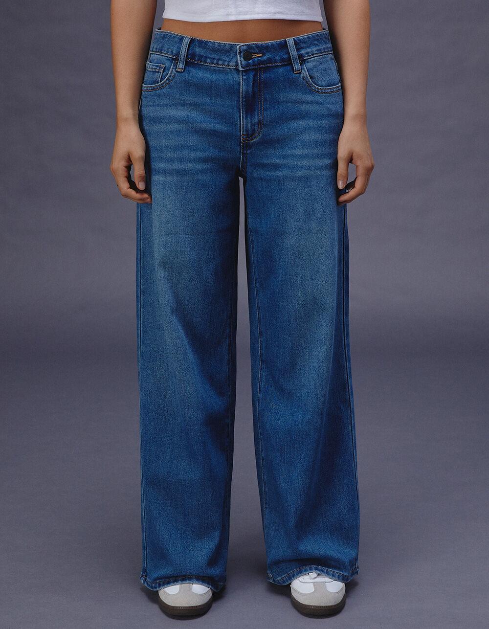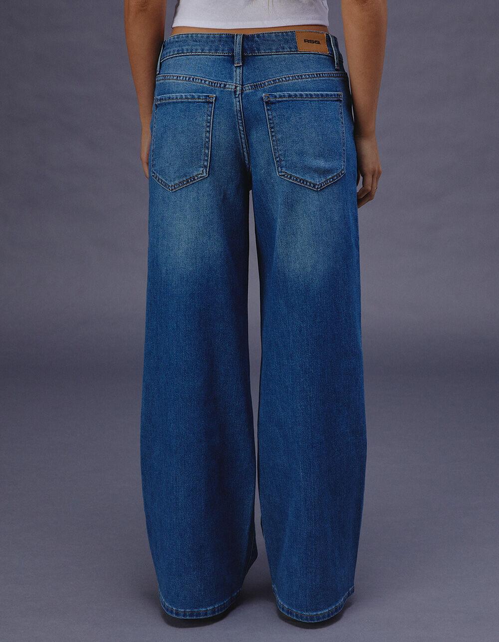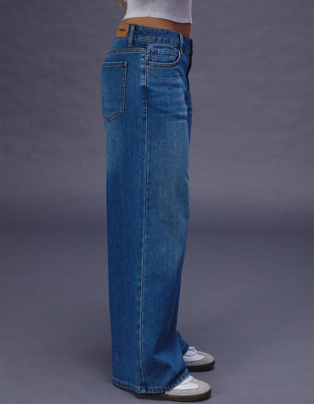 MEDIUM WASH. RSQ Mid Rise Wide Leg Jeans. Zip fly and button closure. Belt loop waist. Mid rise. Traditional five pocket styling. Wide leg. Loose fit. Medium wash. Non-stretch denim. Approx. inseam: 31''. 69% Cotton, 27% Polyester, 3% Rayon, 1% Spandex. Machine wash. Imported.