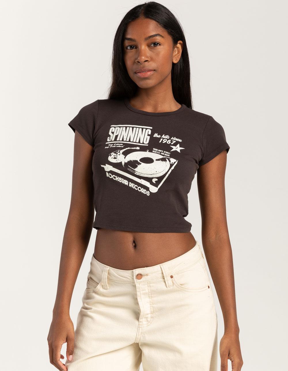WASHED BLACK. RSQ Record Baby Tee. Large graphic screened on front. Ribbed crew neckline. Short sleeve. Shrunken fit. 100% Cotton. Machine wash. Imported.