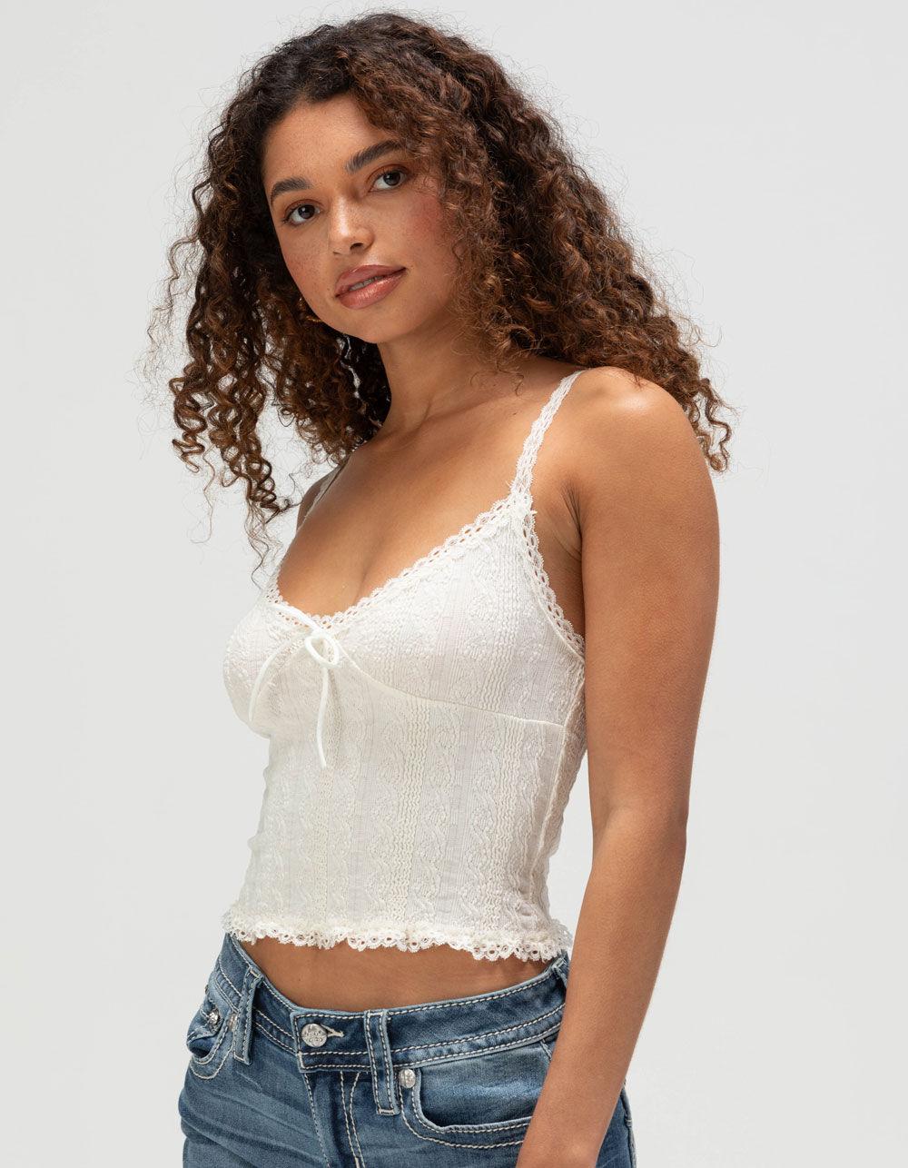 CREAM. RSQ Textured Cami. The RSQ Textured Cami is all about soft, feminine details. Made from a plush textured fabric, this cropped V-neck cami feels as good as it looks. Delicate lace trim adds a romantic touch, while the adjustable straps ensure a perfect fit. A bow tie detail at the neckline completes the look with a hint of charm. Crafted from a cotton-blend fabric with a touch of stretch, this cami is perfect for layering or wearing on its own for an effortlessly pretty vibe. 83% Cotton 15% Polyester 2% Spandex. Machine wash. Imported.