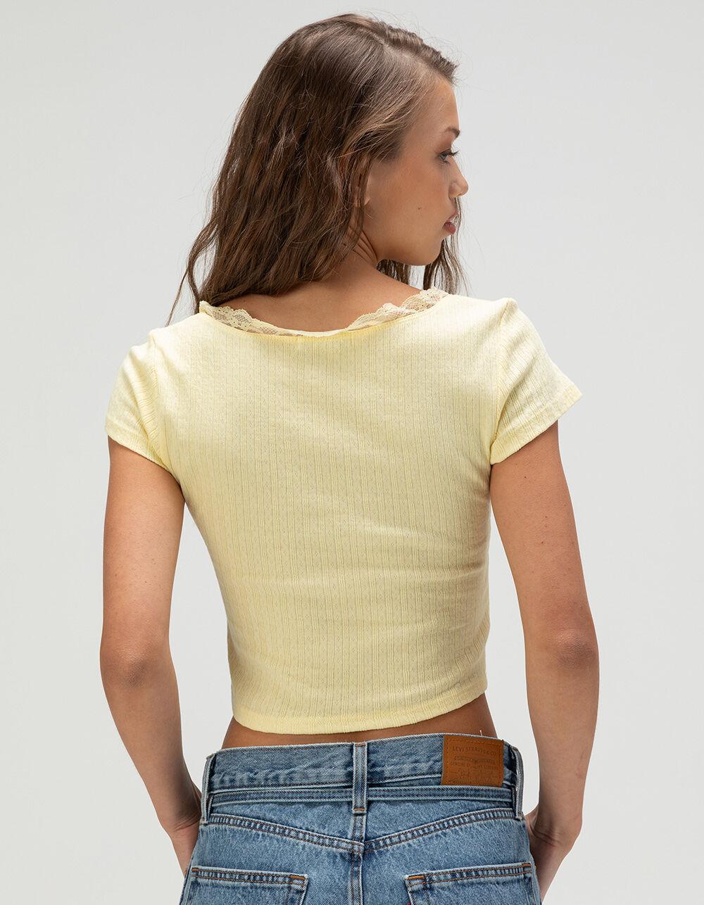 RSQ V-Neck Lace Trim Top. The RSQ V-Neck Lace Trim Top offers a charming and feminine touch to your wardrobe. Made from soft pointelle fabric, this top features delicate gathering at the chest for added texture and shape. The V-neckline is adorned with lace trim at the collar, while a bow tied at the neckline adds a sweet, polished detail. Short sleeves complete the look, making this 100% cotton top perfect for layering or wearing on its own for a stylish, understated look. Machine wash. Imported.