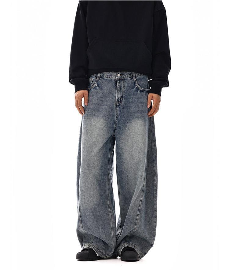 Model is 5ft 9''(176cm) tall, 145 lbs(66kg) weight and wearing a size L5ft 8.5''(174cm) tall, 135 lbs(61kg) wearing size M168cm 59kg wearing a size M185cm 77kg wearing a size XL - Reconstructed- BLUE DENIM- Scimitar baggy- Washed