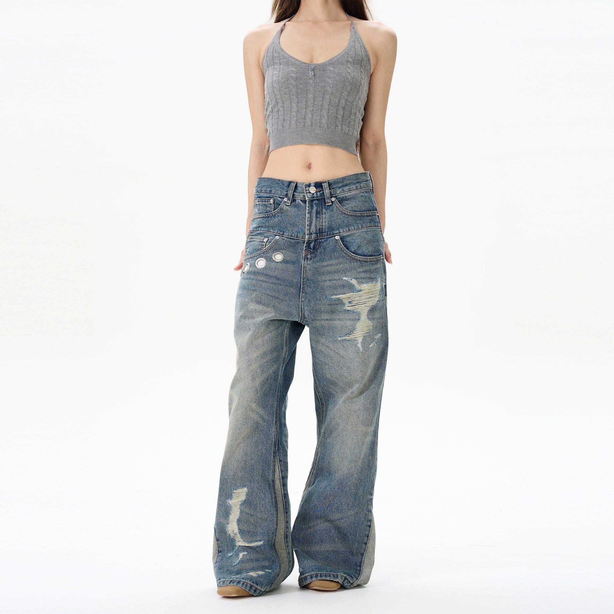 Model is 5ft 10''(178cm) tall, 145 lbs(66kg) weight and wearing a size L168cm 59kg wearing a size M - DOUBLE-WAISTED- Distressed- DENIM- Straight fit