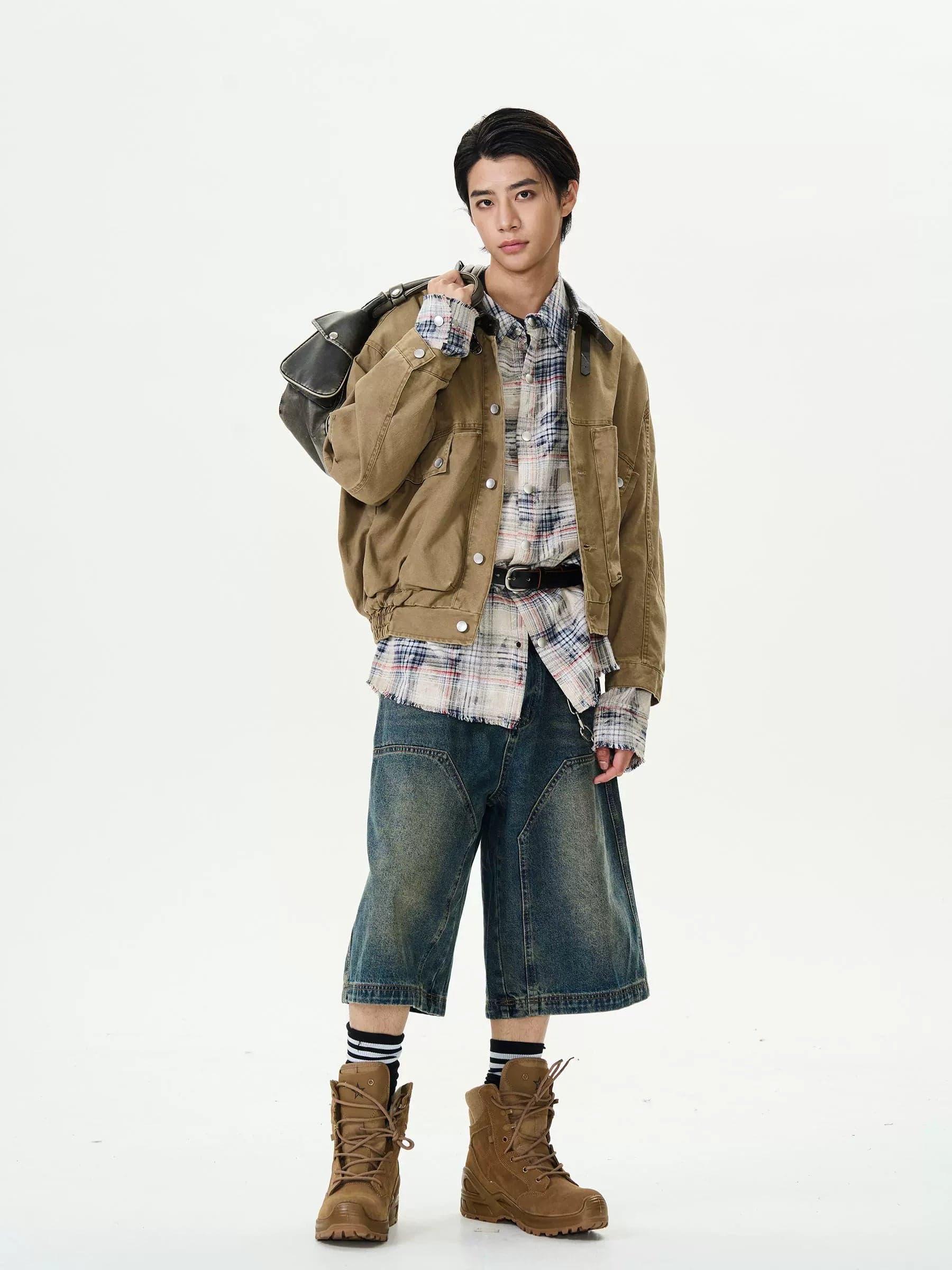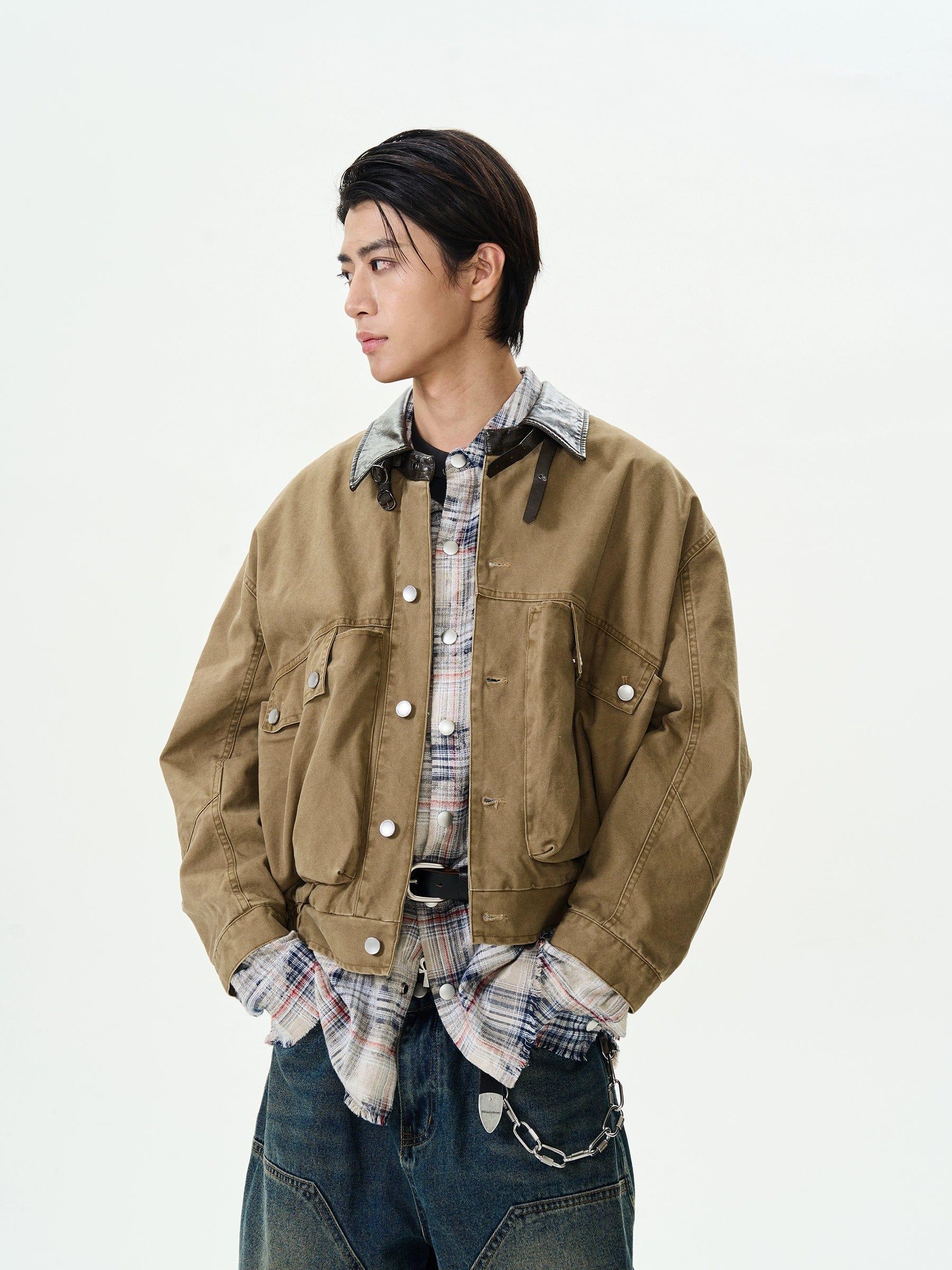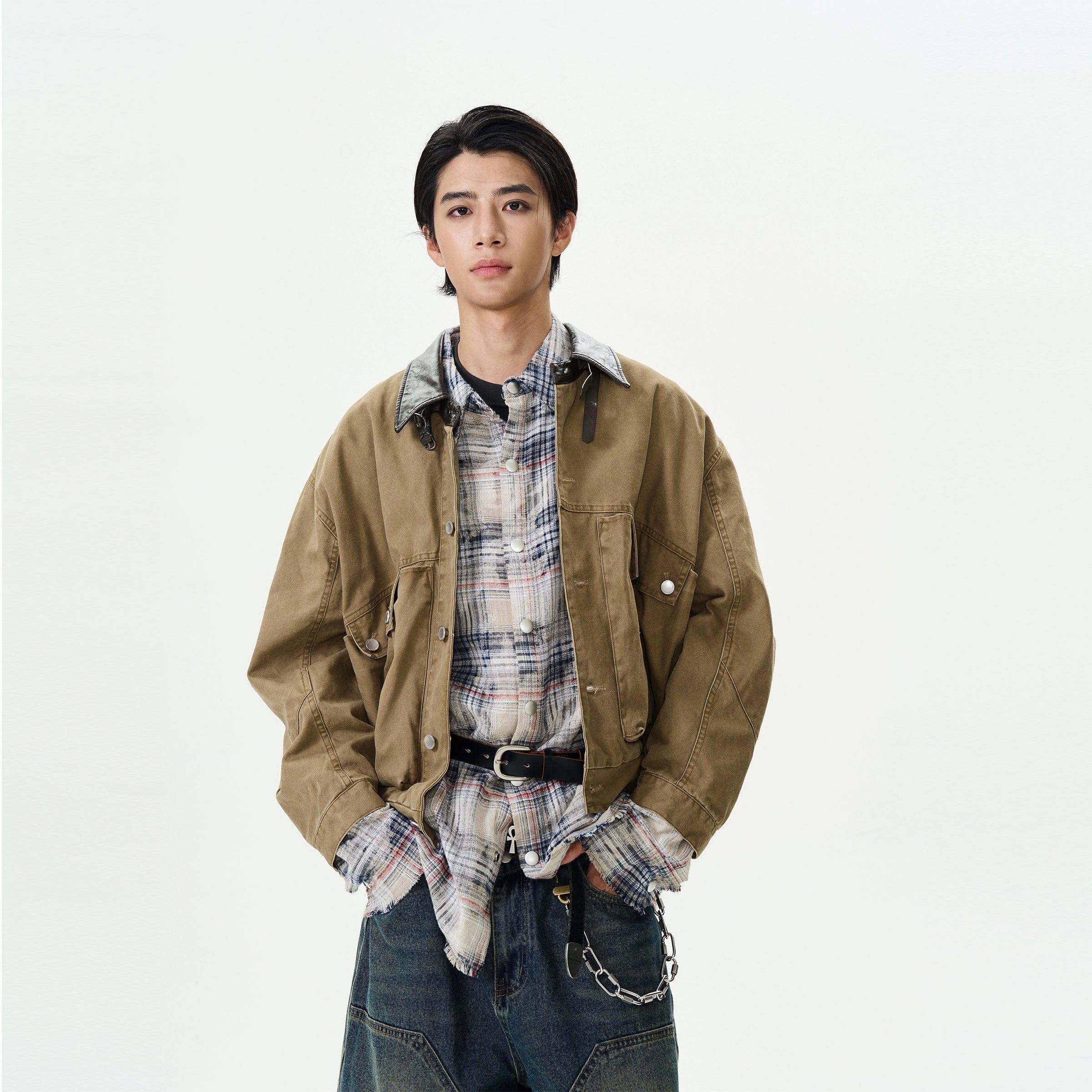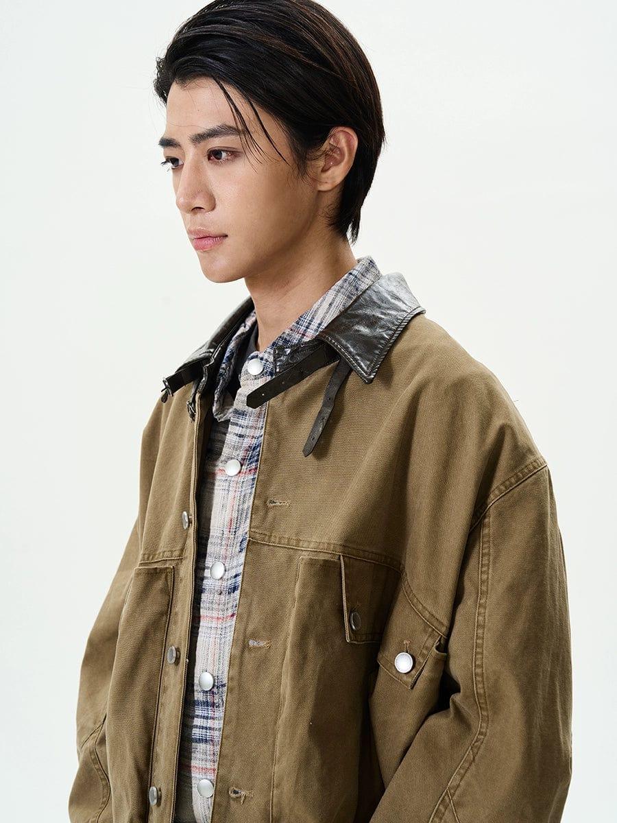 Model is 5ft 10''(178cm) tall, 145 lbs(66kg) weight and wearing a size L168cm 59kg wearing a size M - KHAKI- WORKWEAR- Button-up- Two-tone collar