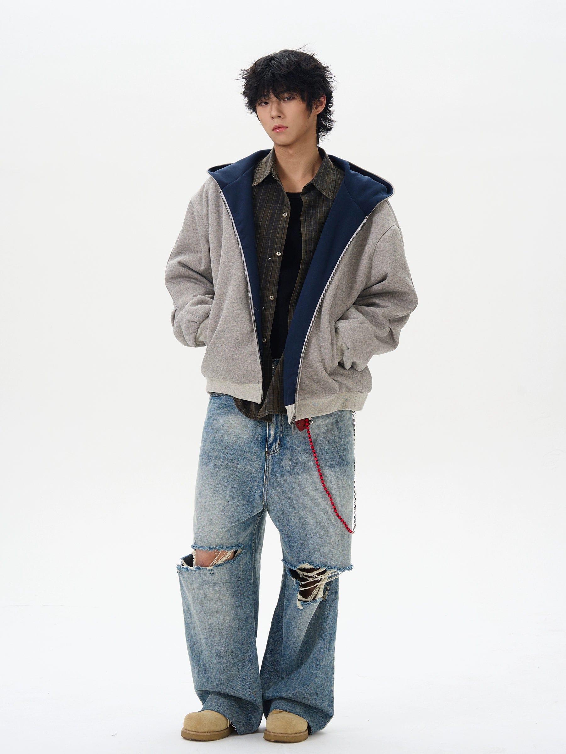 Model is 5ft 10''(178cm) tall, 145 lbs(66kg) weight and wearing a size L168cm 59kg wearing a size M - UNISEX- RIPPED- Distressed - DENIM- Wide straight fit