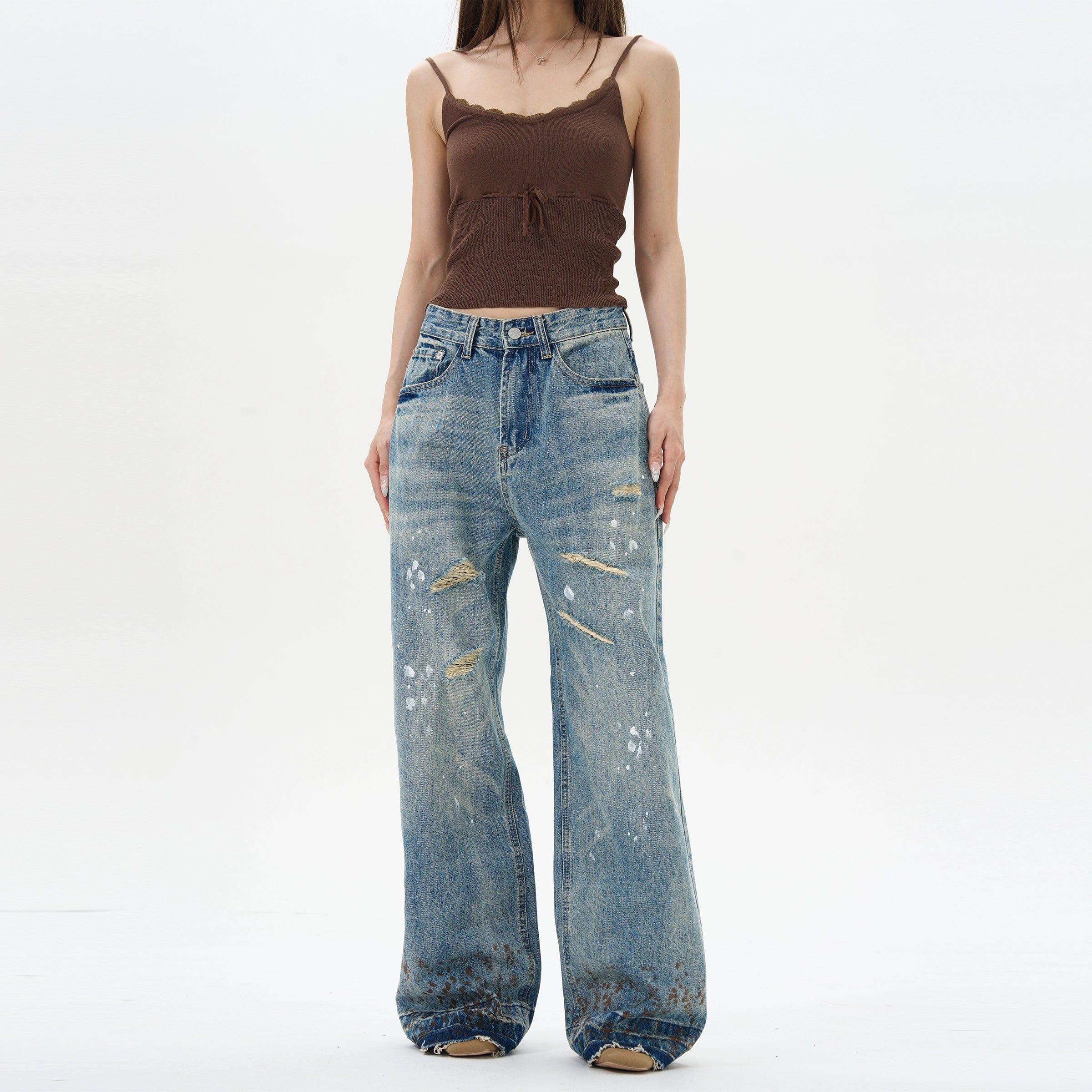 RT No. 10366 BLUE DISTRESSED WIDE STRAIGHT DENIM JEANS