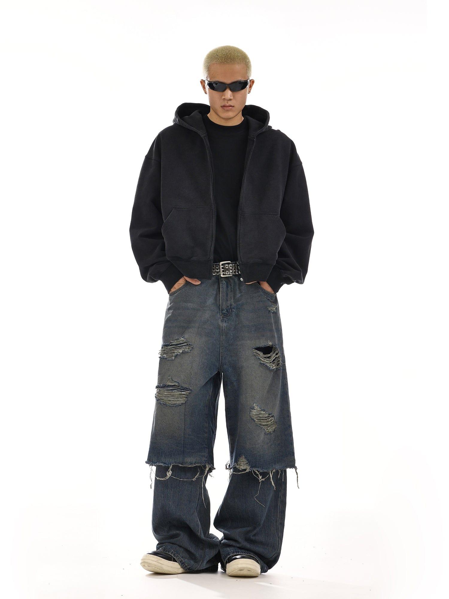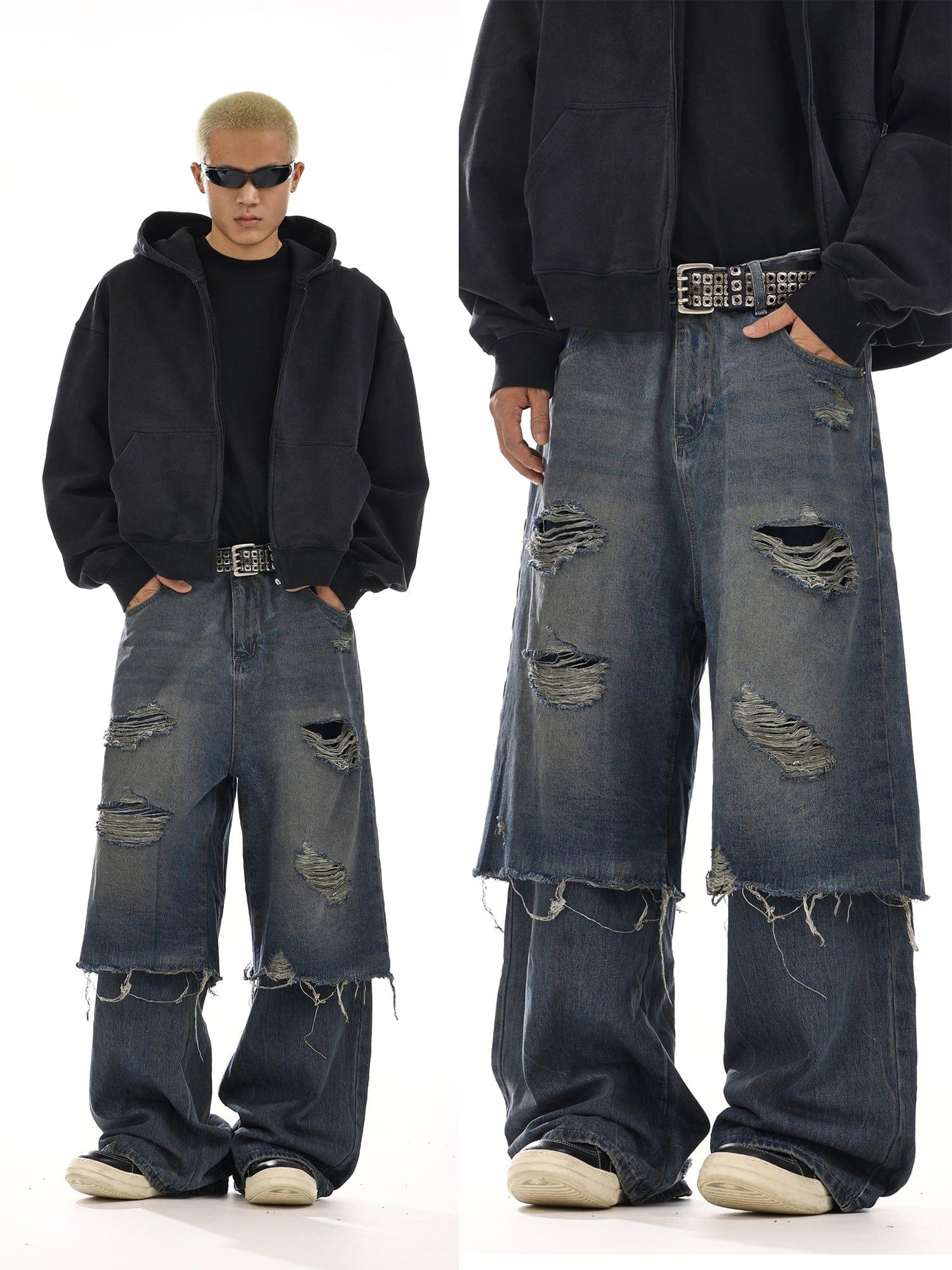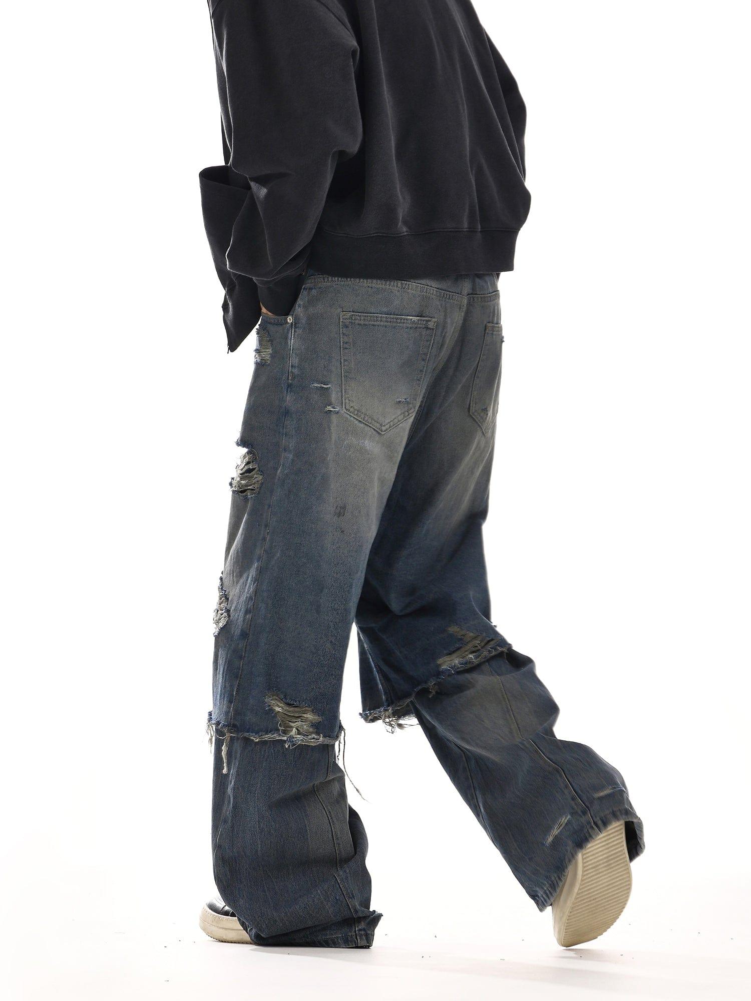Model is 5ft 9''(176cm) tall, 145 lbs(66kg) weight and wearing a size L5ft 8.5''(174cm) tall, 135 lbs(61kg) wearing size M168cm 59kg wearing a size M185cm 77kg wearing a size XL - BLUE- Distressed (ripped)- DENIM- Wide straight fit