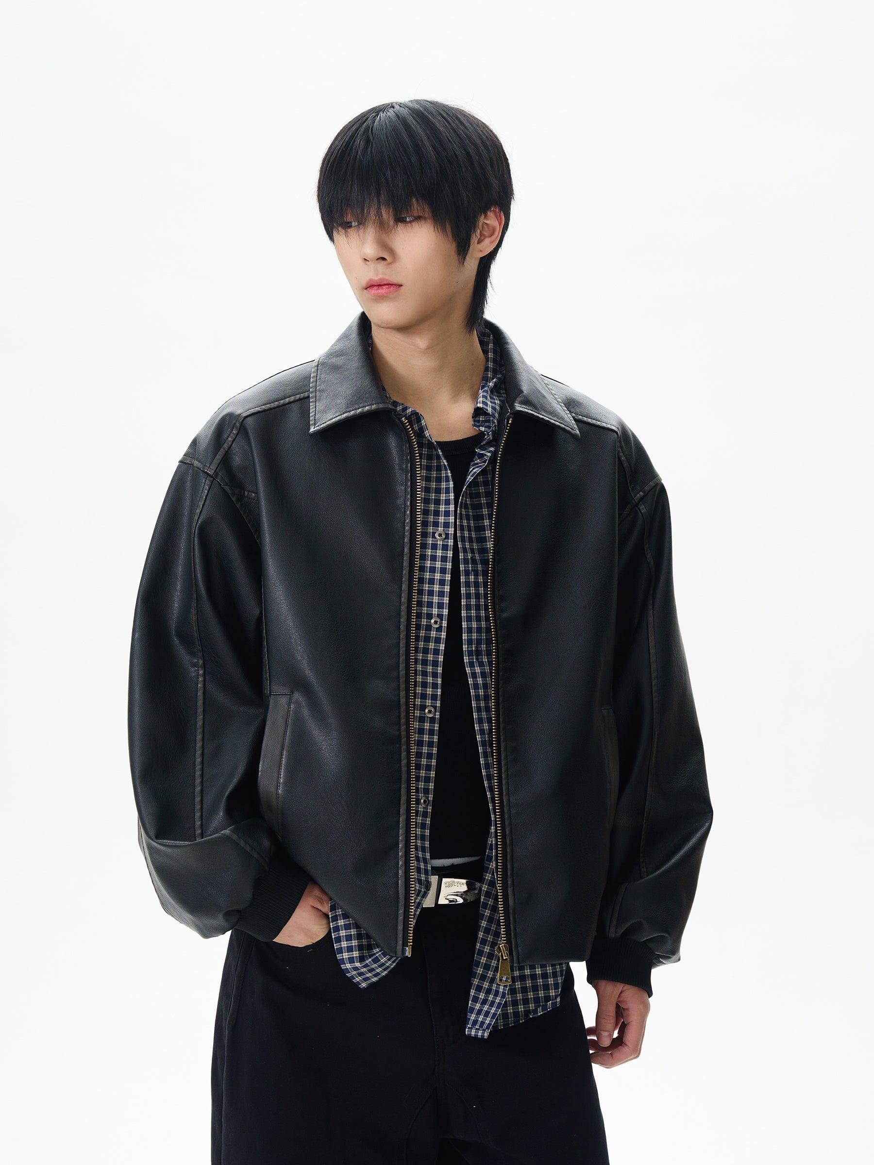 Model is 5ft 10''(178cm) tall, 145 lbs(66kg) weight and wearing a size L168cm 59kg wearing a size M - BLACK- FAUX LEATHER- Zip-up- Loose fit- Collar