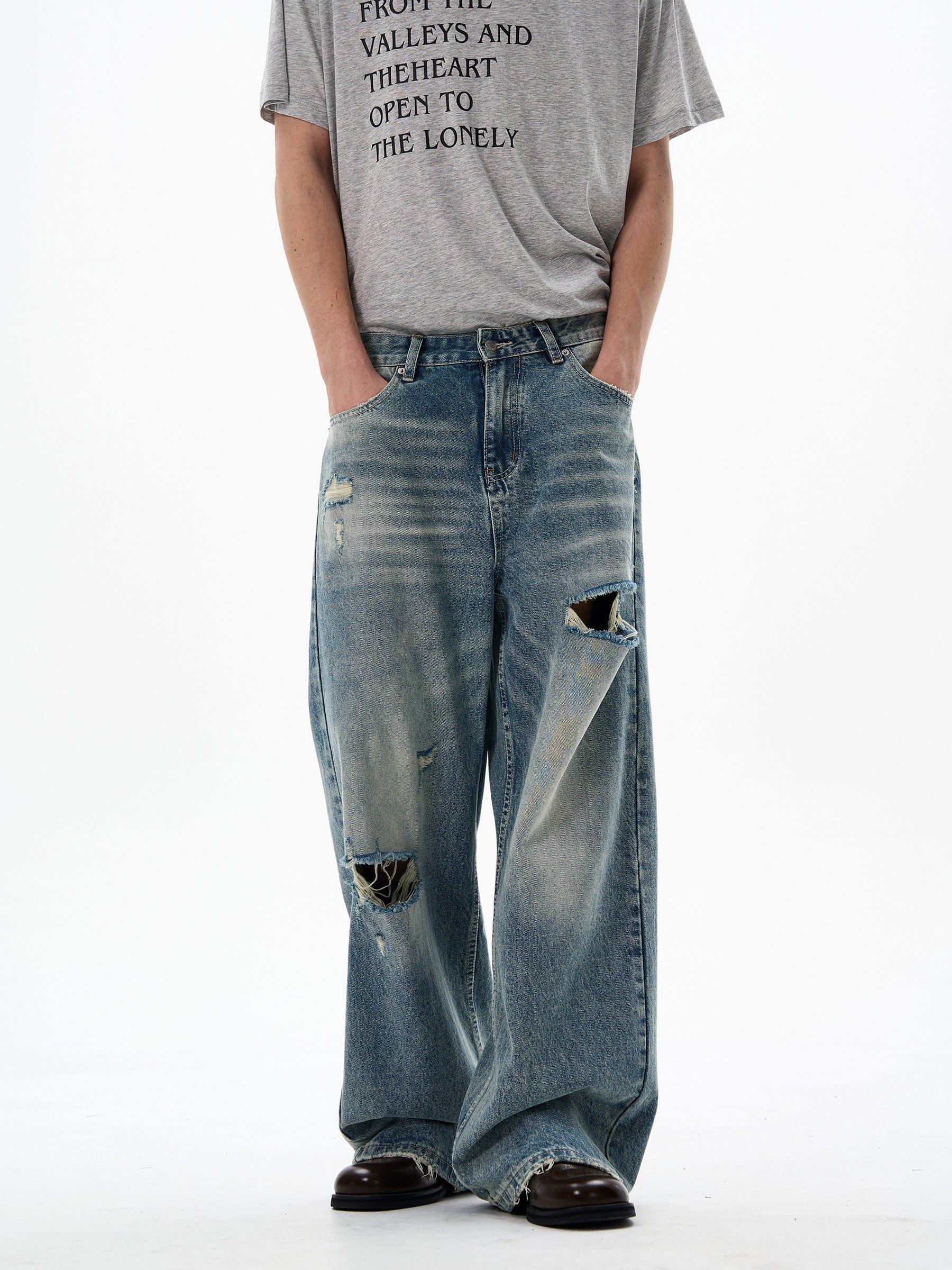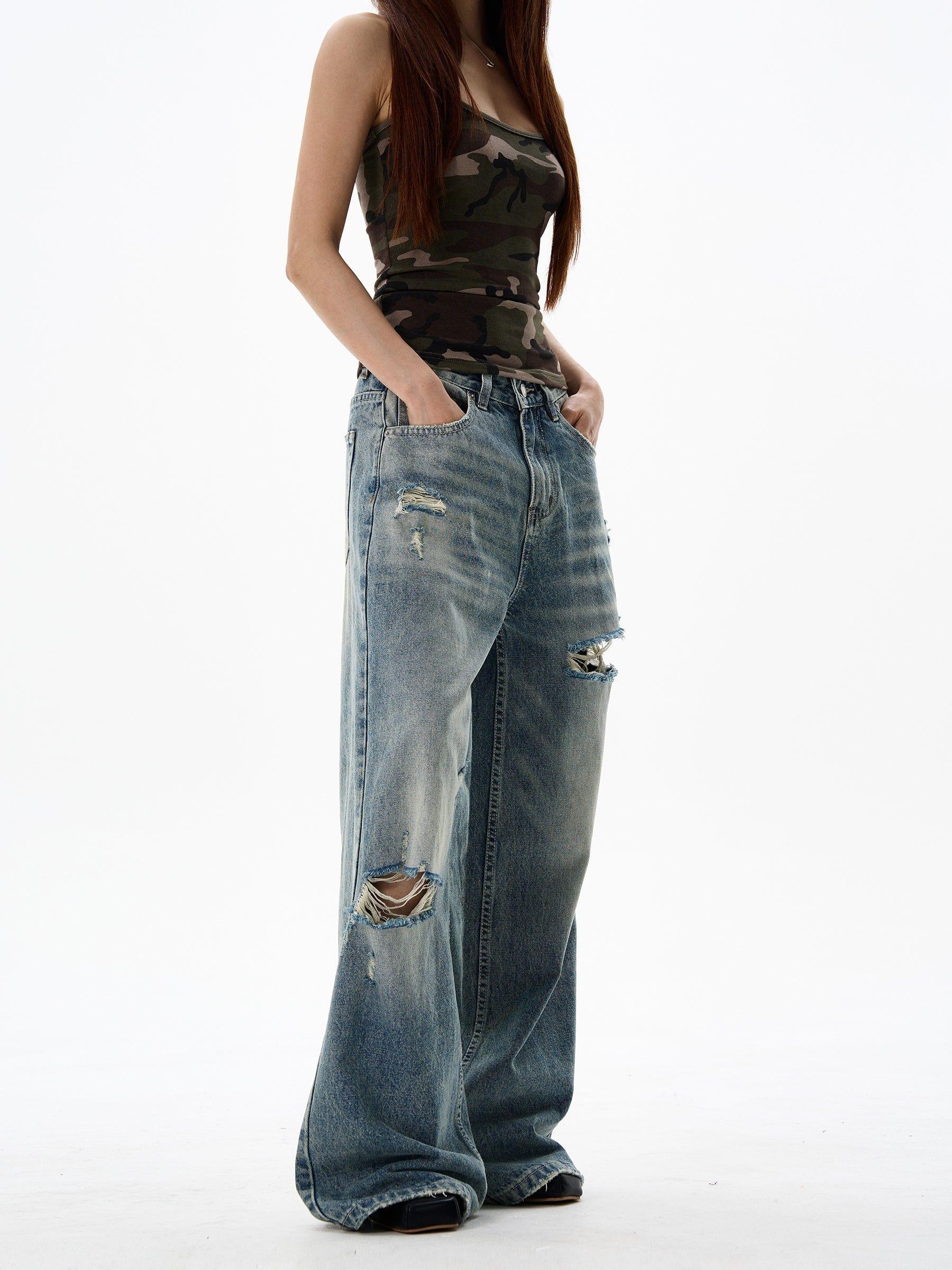 RT No. 10366 BLUE DISTRESSED WIDE STRAIGHT DENIM JEANS