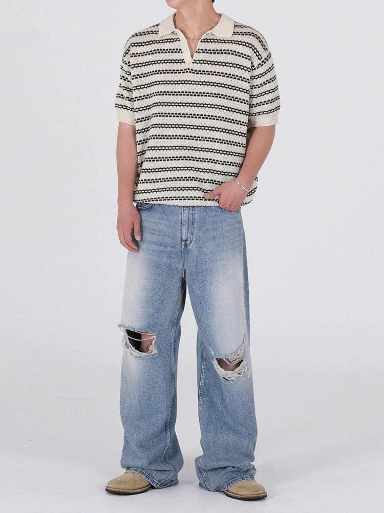 - Knitted- Polo - Short sleeve- Striped - CREAM