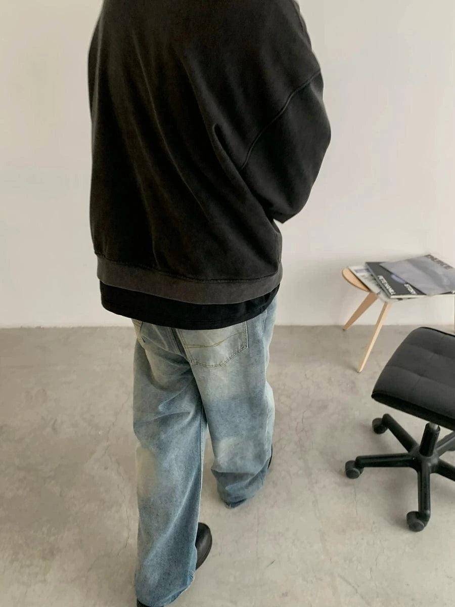Model is 6ft (185cm) tall, 159 lbs(72kg) weight and wearing a size XXL 160cm 42.5kg wearing size S - WASHED BLUE- DENIM- Straight fit- Drape style