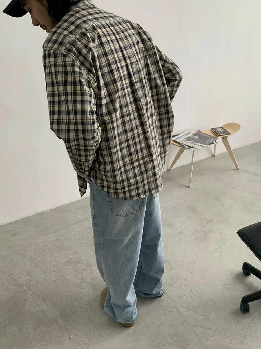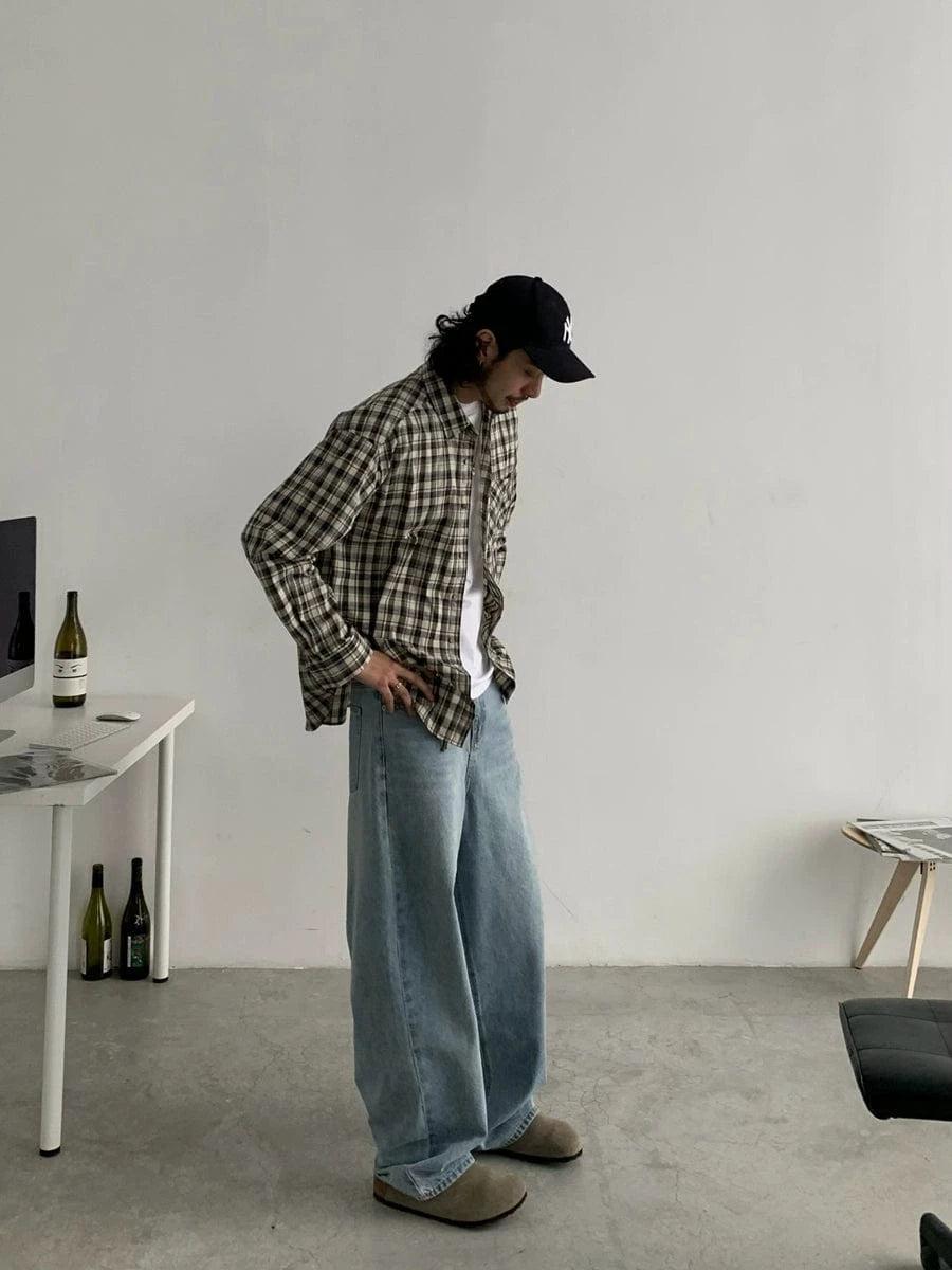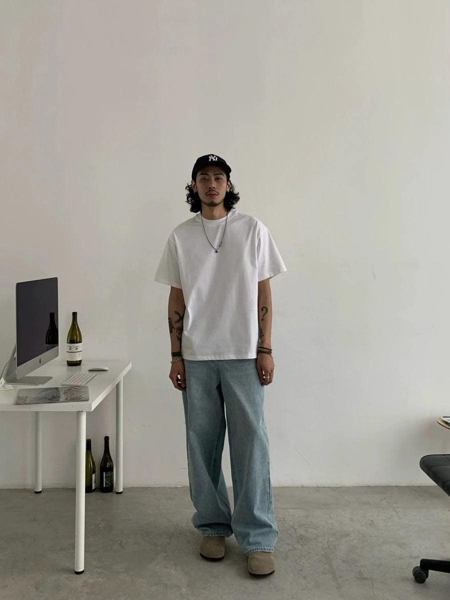 Model is 6ft (185cm) tall, 159 lbs(72kg) weight and wearing a size XL 160cm 42.5kg wearing size S - WASHED BLUE- Baggy straight fit- DENIM