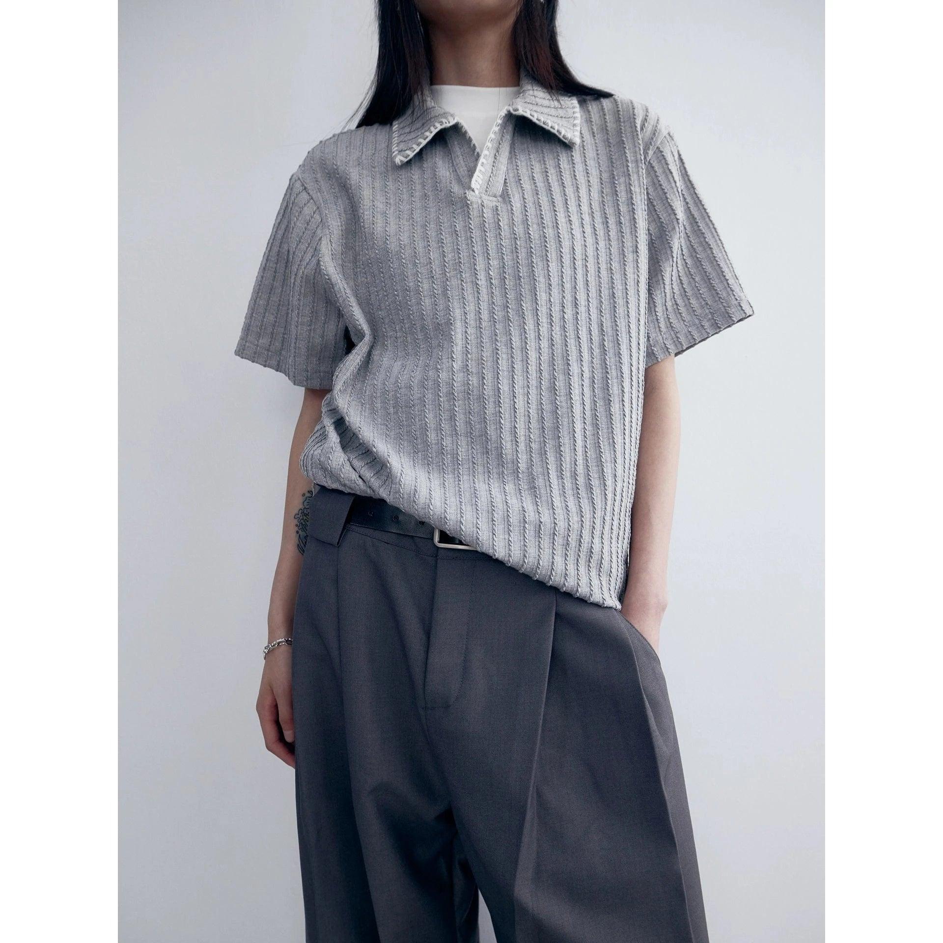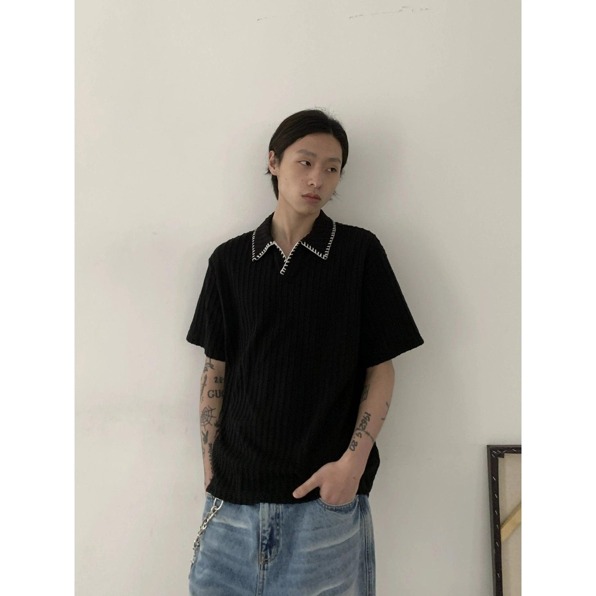 RT No. 5249 BLACK VERTICAL KNITTED SHORT SLEEVE COLLAR SHIRT