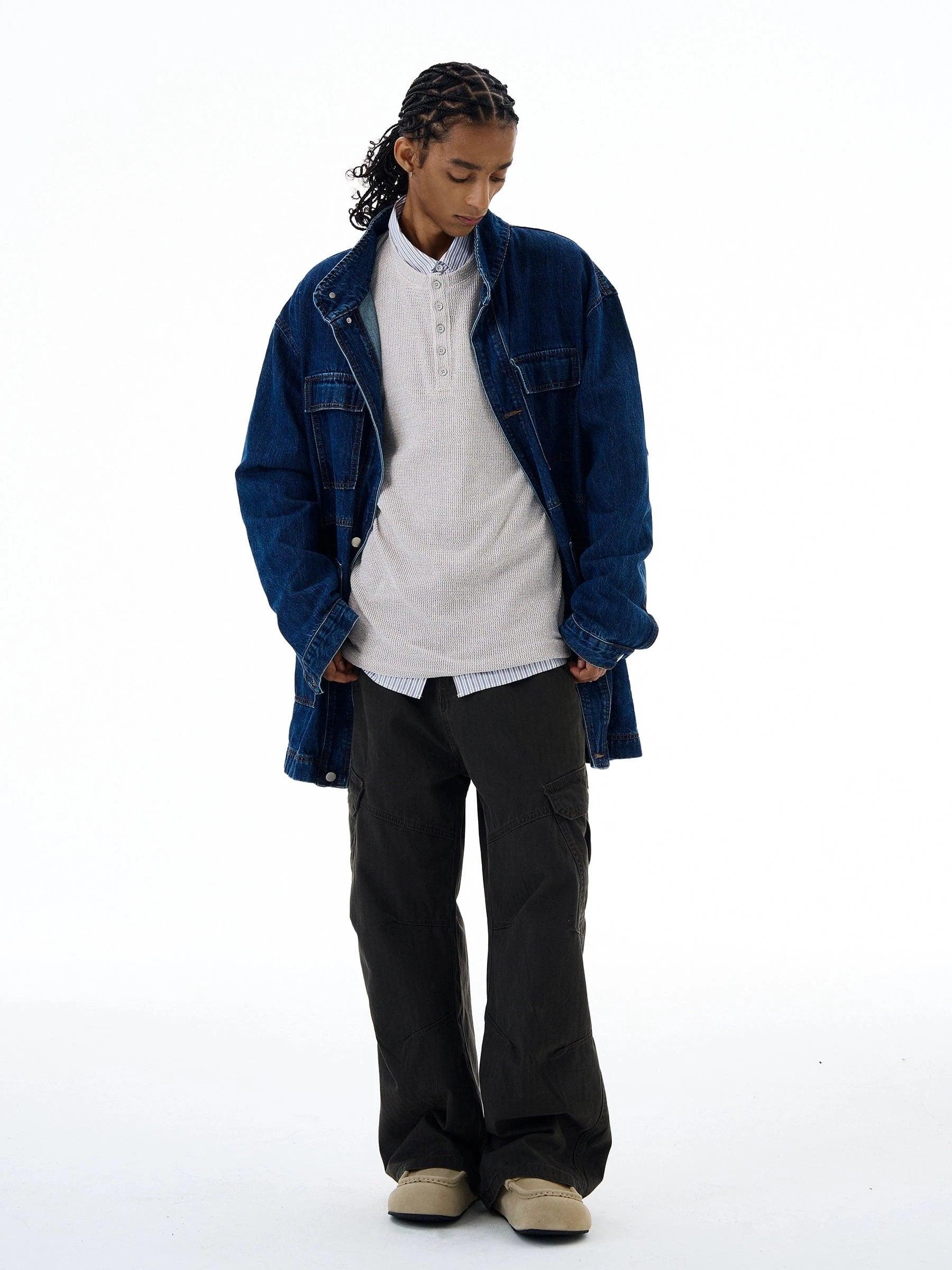 Model is 5ft 10''(178cm) tall, 145 lbs(66kg) weight and wearing a size L168cm 59kg wearing a size M - OVERSIZE fit- NAVY BLUE- DENIM- Chest pockets