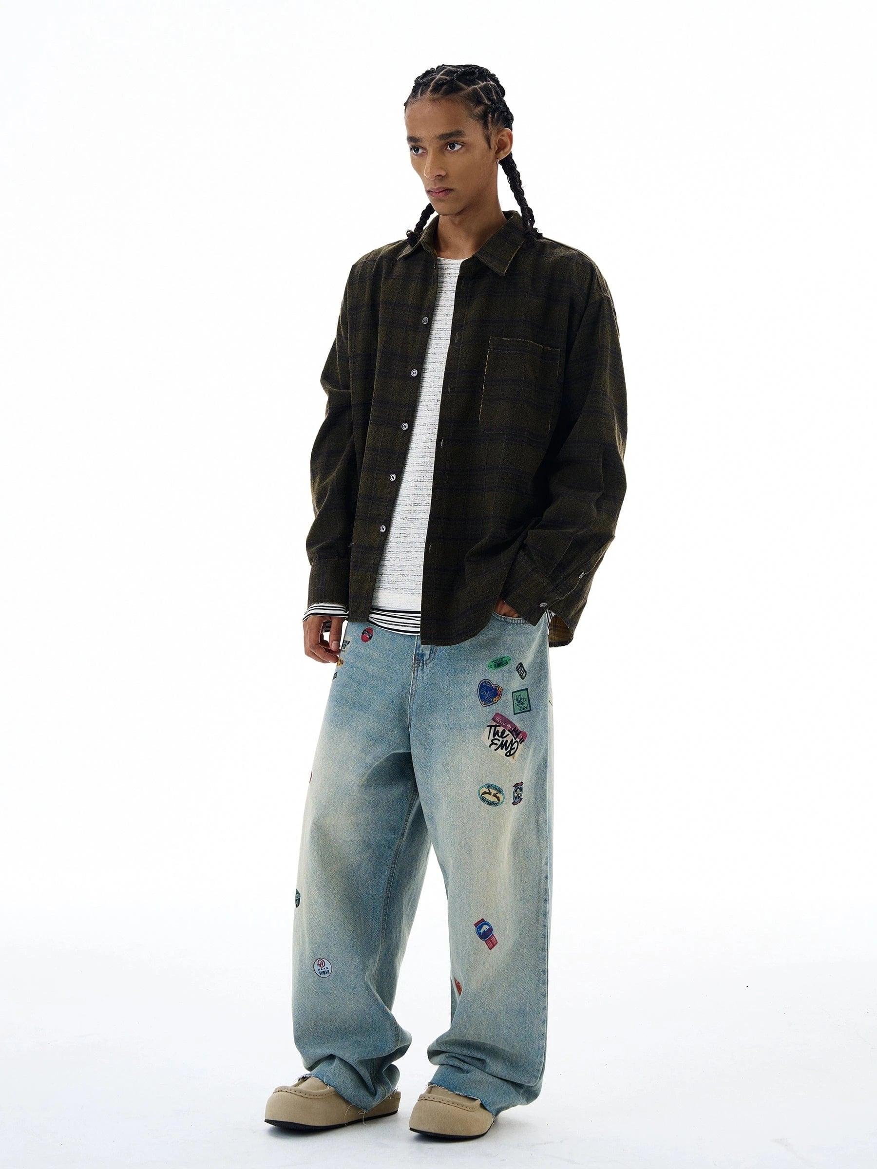 RT No. 19567 PRINTED LABEL BLUE DENIM BAGGY STRAIGHT JEANS Unisex