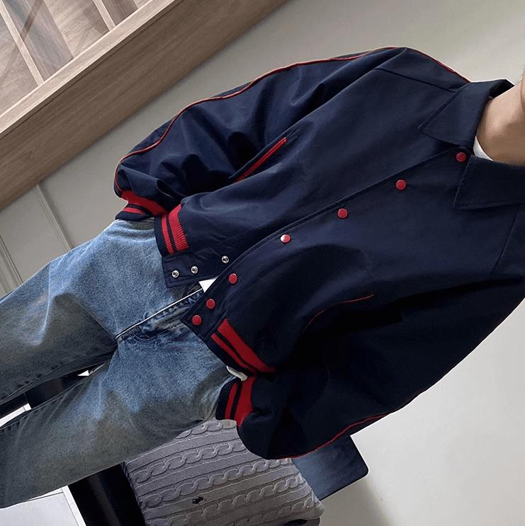 - NAVY BLUE- Button-up- Collar- Red stripe- Contrast