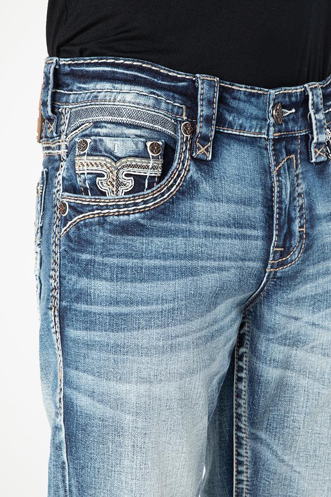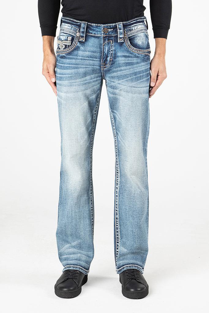 · Copper rivets and buttons throughout · Combo fabric patchwork on inverted Fleur de Lis back pockets · "Rock Revival" metal engraved with double "RЯ" emblem on a beige and orange leather patch on the waistband Designed with care and creativity in Los Angeles, California.