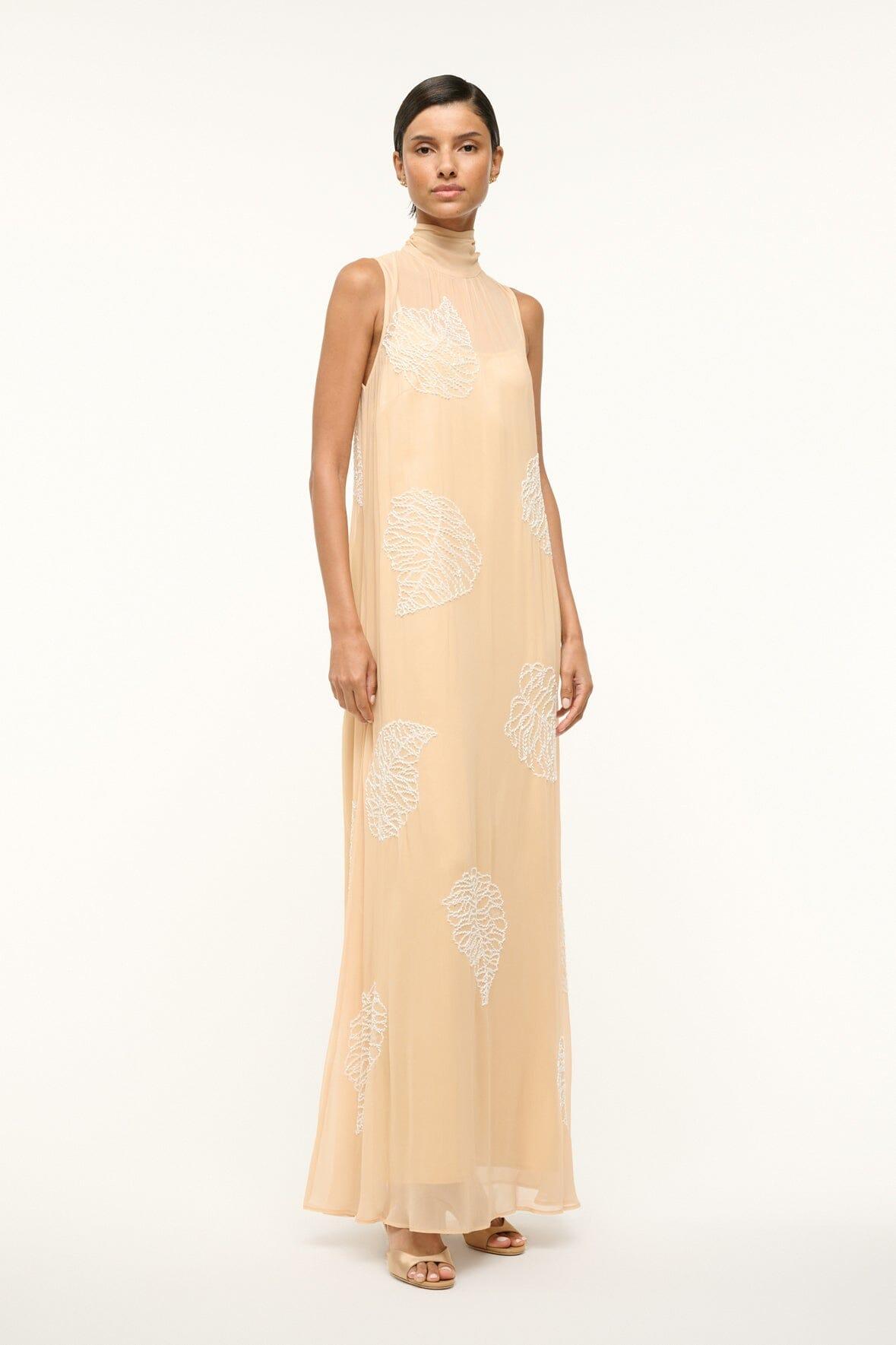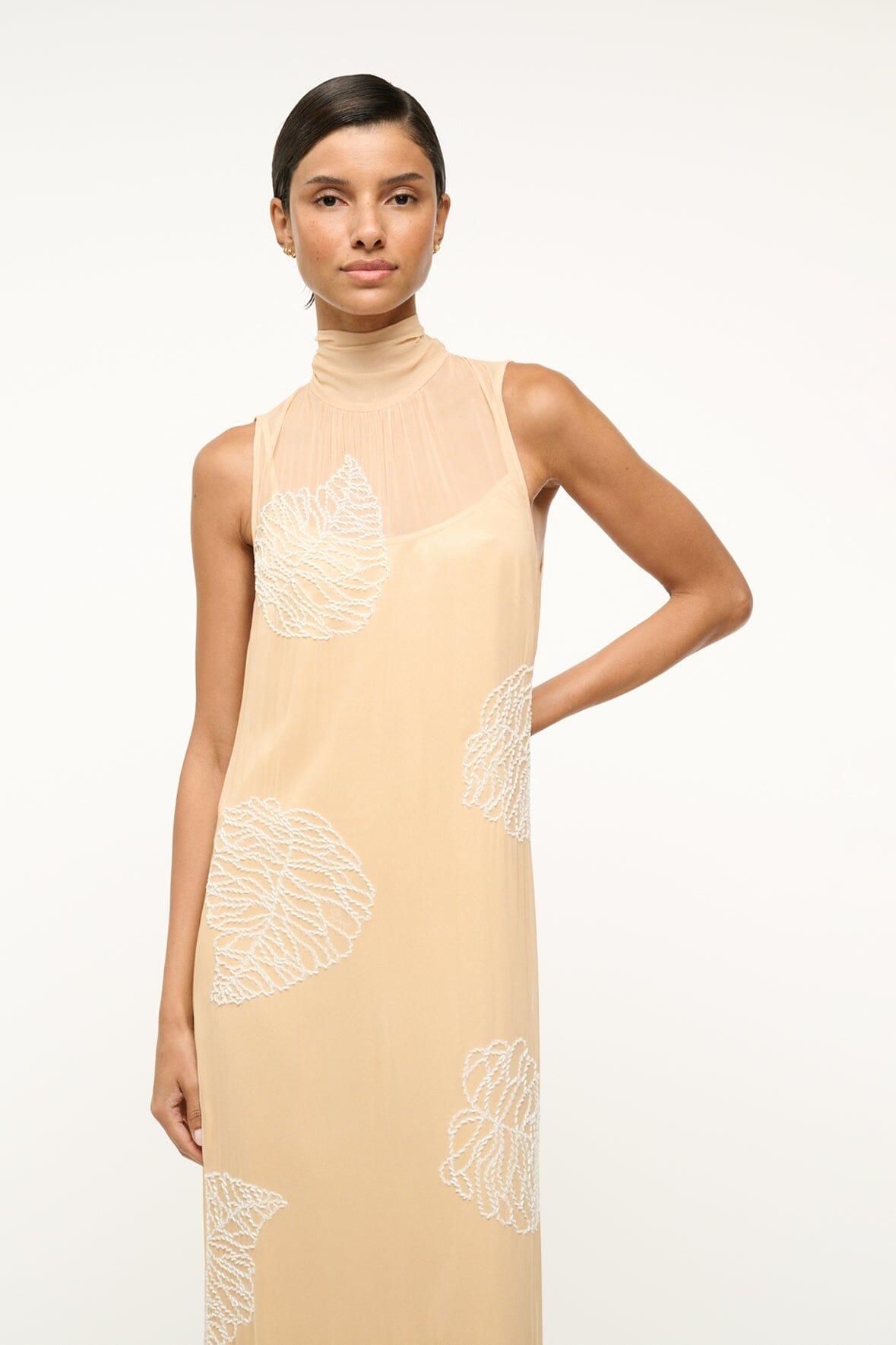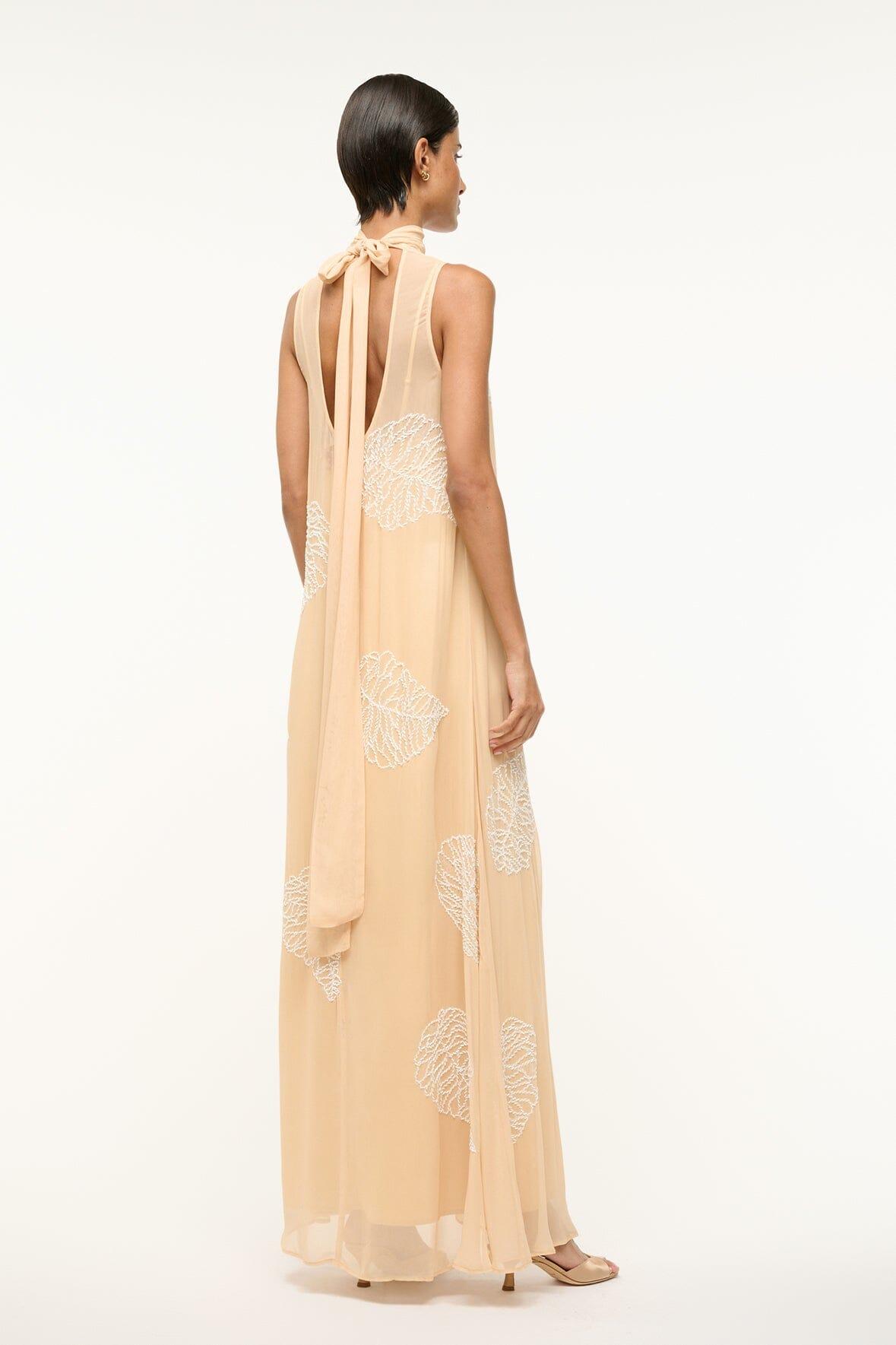 A sleeveless high neck dress made from beaded chiffon, the Rubi features a 3D palm leaf applique and back neck tie.