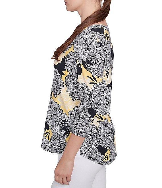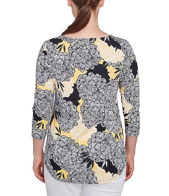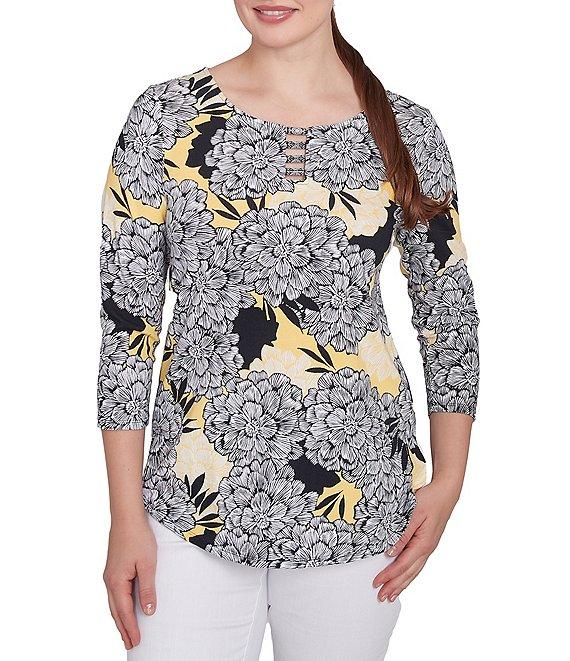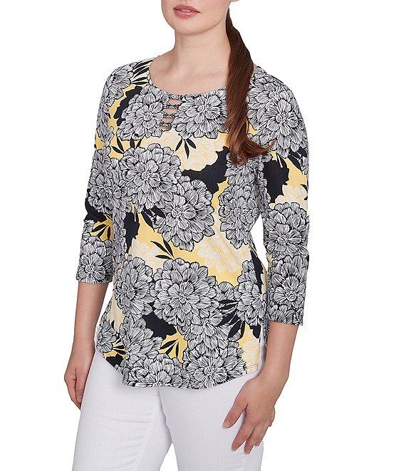 From Ruby Rd., this top features: Soft comfortable knit fabrication Crew neckline with three beaded bars detail 3/4 sleeves Abstract floral pattern in shades of yellow and black Round hemline Pullover construction Cotton/spandex Machine wash/tumble dry Imported. Embrace the vibrant beauty of our Dahlia Garden Knit Top. This stunning piece features a captivating abstract floral pattern in shades of yellow and black, reminiscent of a blooming dahlia garden. The three beaded bars at the neckline add a touch of glamour and sophistication. Crafted from soft and comfortable knit fabric, this top is perfect for a variety of occasions.