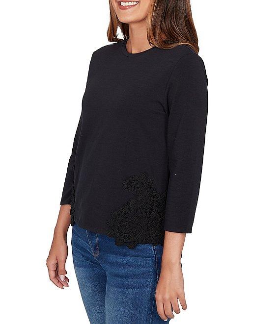 From Ruby Rd., this top features: Cotton-blend knit fabrication Crew neckline 3/4 sleeves Lace appliqué at the sides Straight hem Pullover construction Cotton/spandex Machine wash Imported. Simple from afar, striking up close. This crew neck top is crafted from a soft, stretchy cotton-blend knit with 3/4 sleeves and bold crochet applique at the hem. A modern shape with just enough texture to keep things interesting.