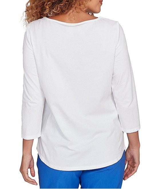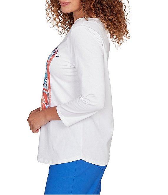 From Ruby Rd., this tee features: Cotton jersey fabrication Crew neckline 3/4 sleeves Bella vista scene Accented with embroidery and heat set crystal Pullover construction Cotton/spandex Machine wash cold Imported. Add a little sparkle to your day with this printed cotton jersey tee featuring a vibrant Bella Vista scene. Accented with embroidery and heat set crystals, it's finished with a classic crew neckline and long sleeves for a polished yet playful touch.