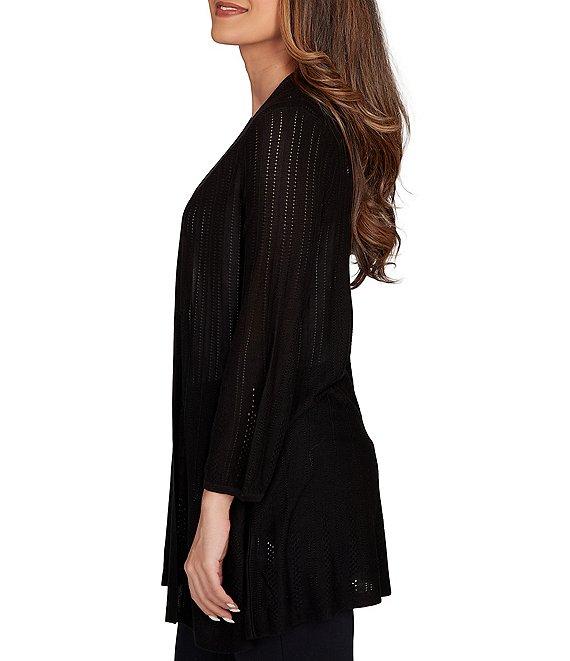 From Ruby Rd., this cardigan features: Cozy ribbed fabrication Open neckline 3/4 sleeves Flowy gored design Straight hemline Open front; no closure Approx. 29.5" length Rayon Hand wash Imported. Cozy without the bulk. This ribbed open-front cardigan wraps you in softness with its flowy gored design and relaxed 3/4 sleeves. The perfect extra layer for easy days and cool nights.
