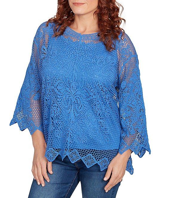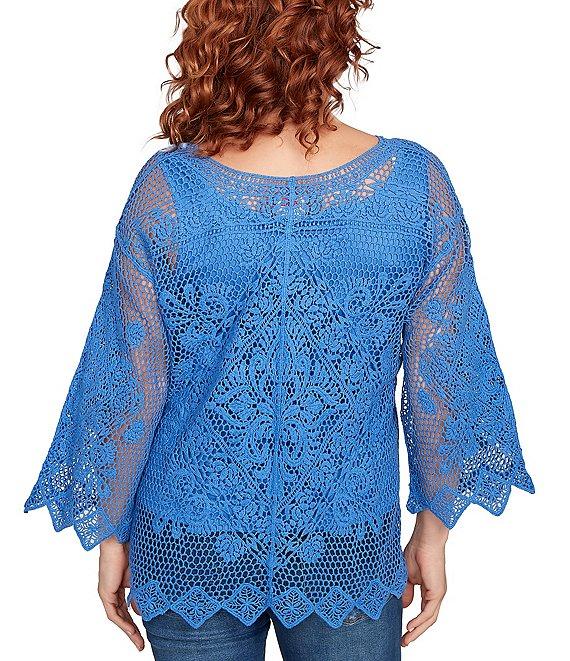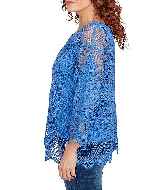 From Ruby Rd., this top features: Lightweight crochet fabrication Scoop neckline 3/4 wide flared sleeves Medallion pattern with floral and ornamental details Tank lining adds extra coverage and versatility Scalloped edges at hem and sleeves Pullover construction Cotton Hand wash cold/lay flat to dry Imported. Discover the intricate craftsmanship of our lightweight crochet top. The delicate crochet knit features a beautiful medallion pattern with floral and ornamental details, creating a visually captivating piece. A soft tank lining provides comfortable coverage, making it perfect for all-day wear. The classic round neckline complements the wide, flared three-quarter sleeves with scalloped edges. The top is finished with a unique scalloped hemline, adding a touch of artisanal detail and enhancing the feminine silhouette.
