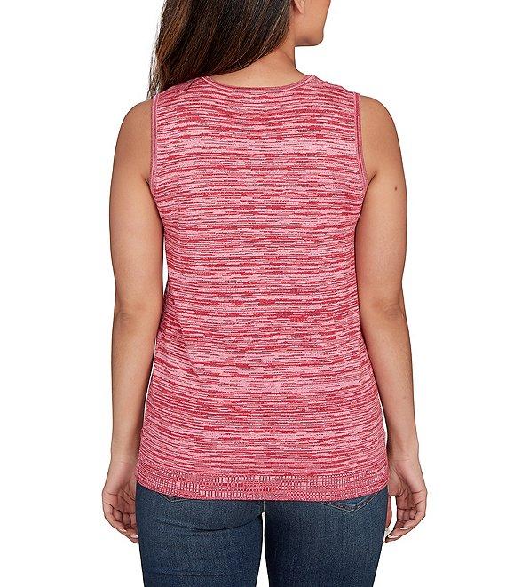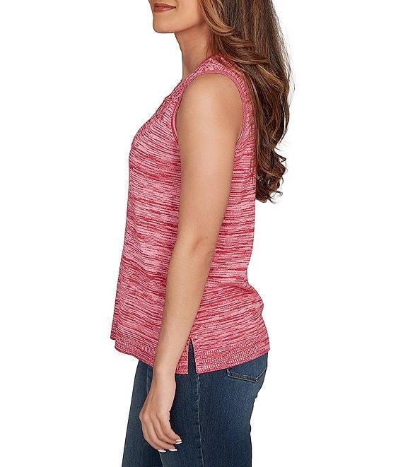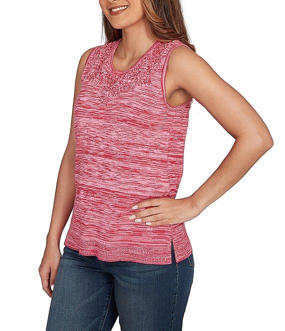 From Ruby Rd., this sweater tank features: Soft marled knit fabrication Scoop neckline Sleeveless Embroidery around the neckline Straight hem with side vents Pullover construction Rayon/nylon Hand wash cold/lay flat to dry/do not iron Imported. Crafted from a soft marled knit, this sleeveless sweater feels great and has subtle color variation throughout. The embroidery around the neckline is simply gorgeous, adding a perfect touch of intricate detail and style. Easy to wear on its own or layered under a jacket or cardigan, it's a versatile sweater tank for any season