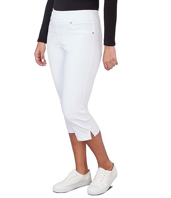 From Ruby Rd., these pants feature: Extra stretch denim fabrication Elasticized waistband Functional pockets Side slits at hem Pull-on construction Approx. 21.50" inseam Cotton/polyester/spandex Machine wash Imported. Our Extra Stretch White Denim Pull-On Capri offers a fresh take on a classic silhouette. Crafted from high-quality denim with added stretch, these capris provide unparalleled comfort and a flattering fit. The vibrant color and functional pockets add a playful touch, while the pull-on design ensures a relaxed and effortless style.