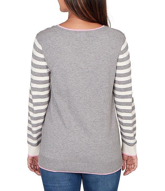 From Ruby Rd., this sweater features: Fine-gauge knit fabrication V-neckline Long stripe sleeves Adorable Maltese puppy design Contrast trim Straight hemline Pullover construction Polyester/rayon/nylon Hand wash cold Imported. This cute and cuddly sweater features an adorable Maltese puppy in a rich fine-gauge knit paired with contrast striped long sleeves. Finished with a flattering V-neck and side split hem, it brings playful energy to chilly days.
