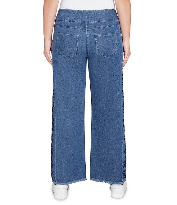 From Ruby Rd., these denim jeans feature: Denim fabrication Wide waistband Bootcut leg Faux front pockets, functional back pockets Floral soft flocked detailing Pull-on construction Approx. 28.25" inseam Tencel™ lyocell/polyester Machine wash/line dry Imported. Flocked and fabulous These bootcut ankle jeans feature a vintage-inspired Tencel(TM) denim and soft flocked detailing for a touch of texture that stands out. With faux front pockets, functional back pockets, and a wide pull-on waistband, they're as easy to wear as they are eye-catching.