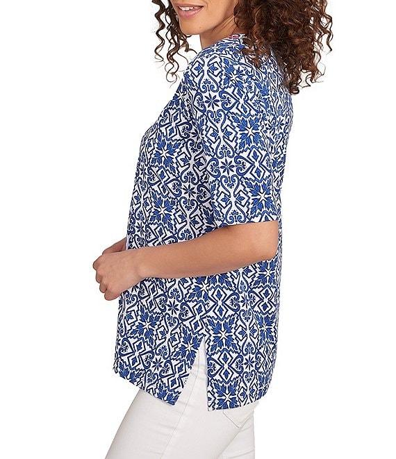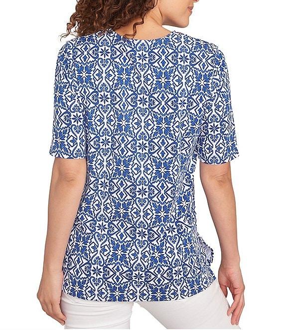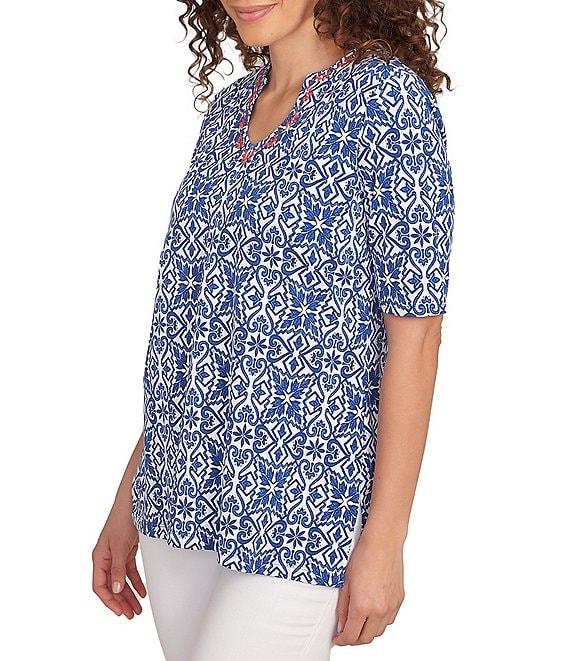 From Ruby Rd., this top features:Stretch knit fabricationSplit round necklineShort sleevesPacific medallion patternEmbellished detail at necklineStraight hem with side ventsPullover constructionCotton/spandexMachine washableImported.Discover this captivating top, featuring a vibrant Pacific medallion pattern that adds a touch of coastal charm. The split scoop neckline creates a modern and alluring look, while the delicate embellishments provide a dazzling focal point. The elbow-length sleeves offer a comfortable and stylish fit.