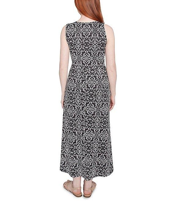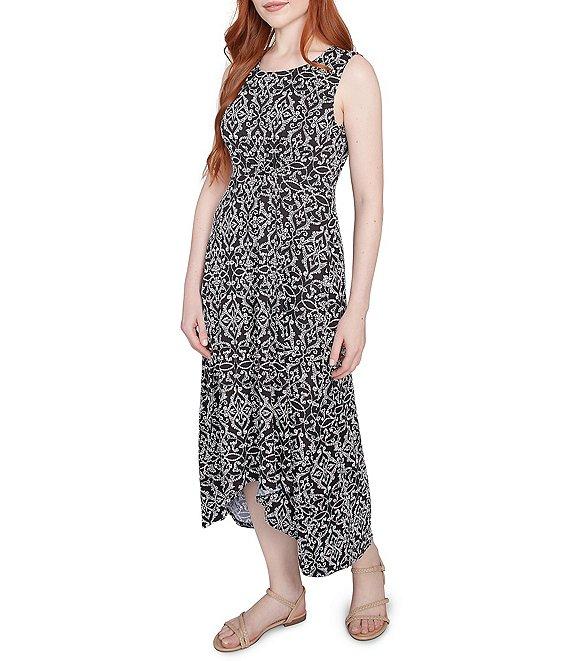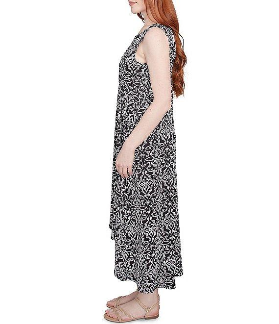 From Ruby Rd., this dress features:Knit fabrication A-line silhouette Scoop necklineSleevelessMedallion print Relaxed fit High-low hemPullover constructionApprox. 45.5" front length, 49.25" back length Polyester/spandexMachine wash cold/line dry/do not iron Imported.This flowy, stretchy dress is perfect for a relaxed and stylish look. The scoop neckline, puff print details, and high-low hemline create a flattering silhouette. The vibrant medallion print and comfortable light knit fabric make it a must-have for any wardrobe.