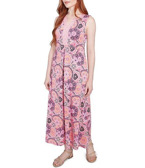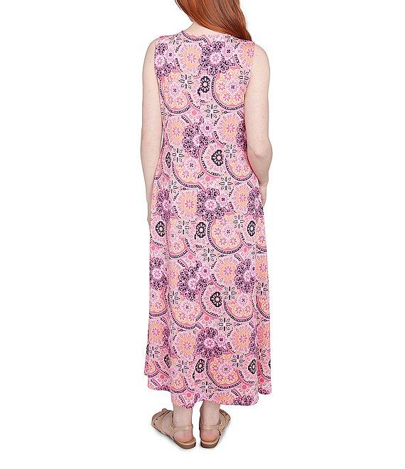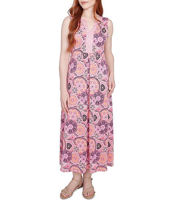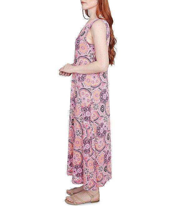 From Ruby Rd., this dress features: Knit fabrication A-line silhouette Split v-neckline Sleeveless Medallion print Relaxed fit Inverted pleated detail Pullover construction Approx. 49.25" length Polyester/spandex Machine wash cold/line dry Imported. This sleeveless maxi dress is perfect for a relaxed and stylish look. The contrasting split neckline adds a touch of sophistication, while the vibrant medallion print and comfortable knit fabric make it a must-have for any wardrobe.