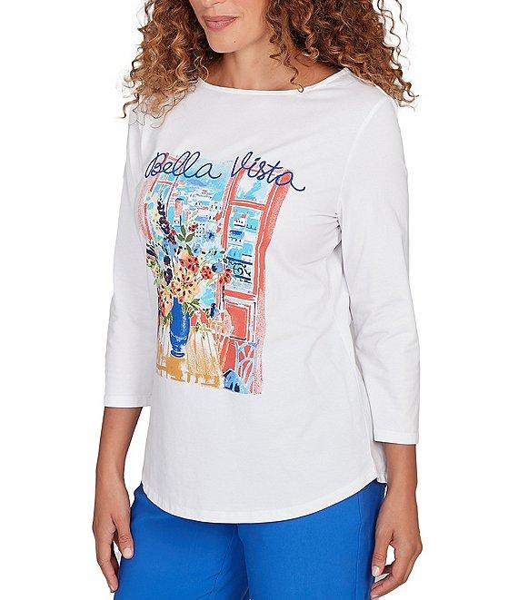 From Ruby Rd. Petite, this tee features: Cotton jersey fabrication Crew neckline 3/4 sleeves Bella vista scene Accented with embroidery and heat-set crystal Pullover construction Cotton/spandex Machine wash cold Imported. Add a little sparkle to your day with this printed cotton jersey tee featuring a vibrant Bella Vista scene. Accented with embroidery and heat-set crystals, it's finished with a classic crew neckline and long sleeves for a polished yet playful touch.