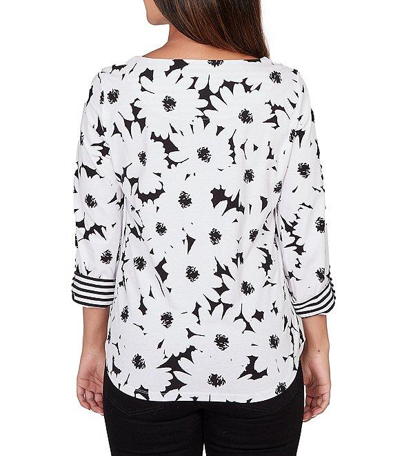 From Ruby Rd. Petite, this top features: Cotton jersey knit fabrication Boat neckline 3/4 striped roll-tab sleeves Playful floral graphic with an embroidered accent Curved hem Pullover construction Cotton/spandex Machine wash cold/line dry Imported. Fresh-picked charm meets everyday ease in this daisy-print cotton jersey tee. Featuring a playful floral graphic with an embroidered accent, it's detailed with striped roll-tab 3/4 sleeves and a curved hem for a fun mix of pattern and polish.