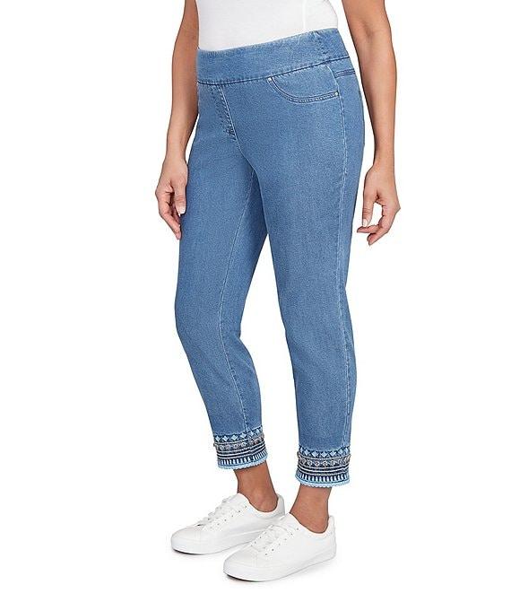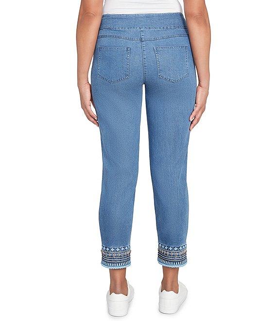 From Ruby Rd., these jeans feature: Denim fabrication Wide waistband Flat front Faux-front pockets Functional back pockets Embroidery with beads at hem Pull-on construction Approx. 26.75" inseam Tencel™ lyocell/polyester Machine wash Imported. Elevate your denim collection with these intricately detailed Tencel(TM) Lyocell denim jeans. The ankle-length hemline features beautiful embroidery and beading, and faux-front pockets add a classic touch.