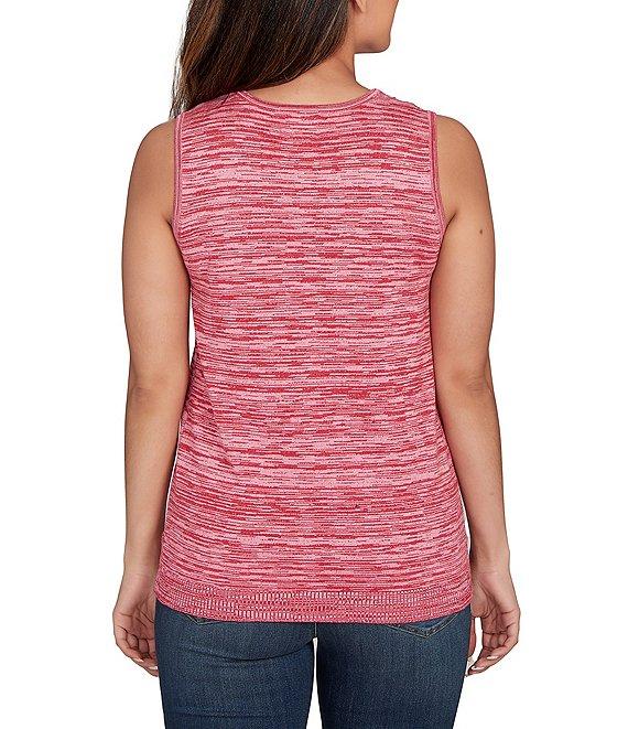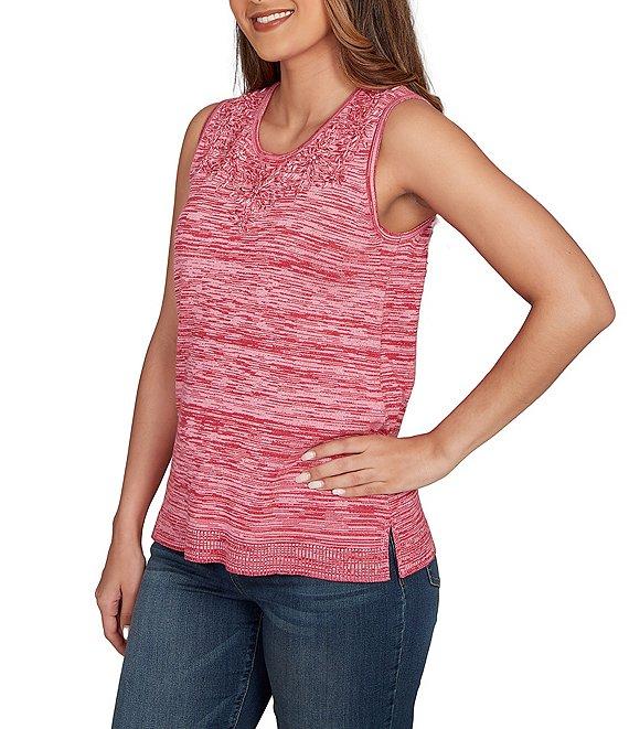From Ruby Rd. Petite, this sweater tank features: Soft marled knit fabrication Scoop neckline Sleeveless Embroidery around the neckline Straight hem with side vents Pullover construction Rayon/nylon Hand wash cold/lay flat to dry/do not iron Imported. Crafted from a soft marled knit, this sleeveless sweater feels great and has subtle color variation throughout. The embroidery around the neckline is simply gorgeous, adding a perfect touch of intricate detail and style. Easy to wear on its own or layered under a jacket or cardigan, its a versatile sweater tank for any season