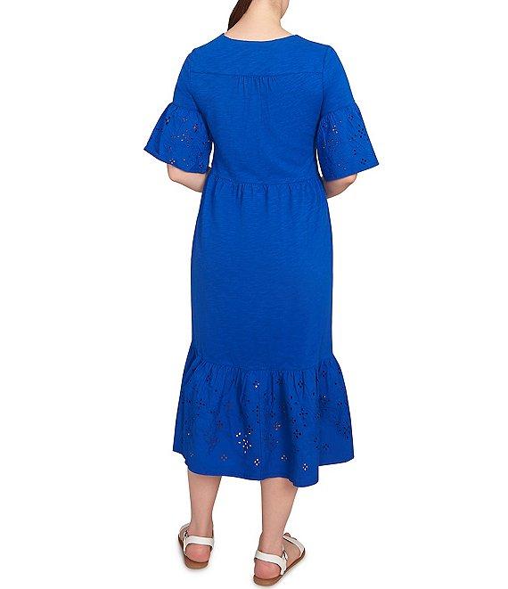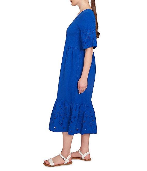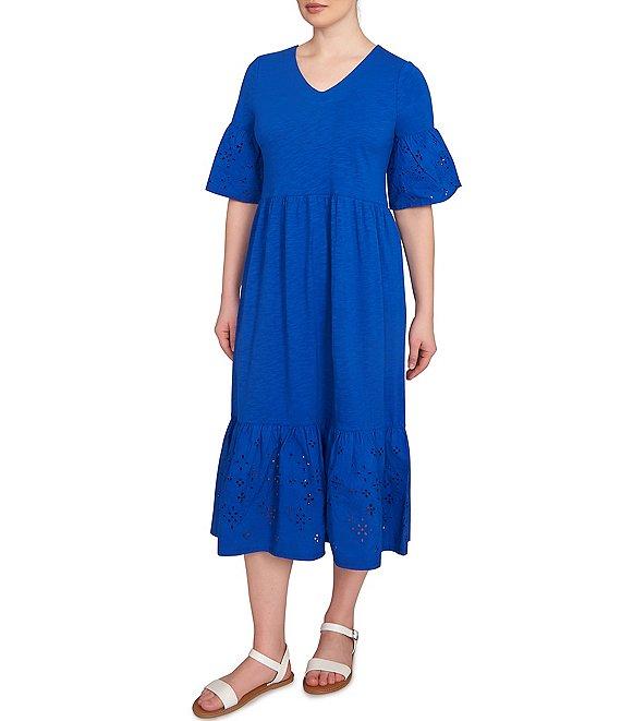 From Ruby Rd. Petite, this dress features: V-neckline Elbow length sleeves Embroidered poplin details Tiered hem Pullover construction Approx. 45" length Cotton Machine wash/line dry Imported. Elevate your wardrobe with our stunning V-Neck Cotton Knit Dress. This versatile dress features a comfortable knit fabric and a flattering v-neckline. The elbow length sleeves with embroidered poplin details add a touch of sophistication, while the tiered hem creates a feminine and flowy silhouette. Perfect for a variety of occasions, this dress is both stylish and comfortable.