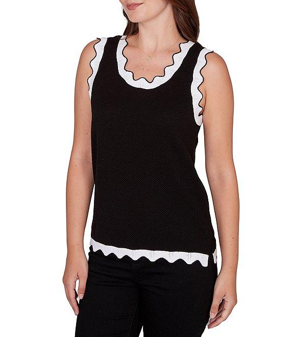 From Ruby Rd., this tank features: Fine gauge fabrication Scoop neckline Sleeveless Scalloped contrast trim along neckline, arms, and hem Straight hemline with side slits Pullover construction Rayon/polyester/nylon Hand wash Imported. Sweet and simple, this fine-gauge stretch tank features scalloped contrast trim along the neckline, arms, and hem. A polished knit layer that pairs beautifully with cardigans or stands stylishly on its own.