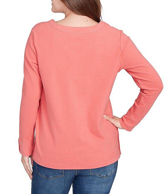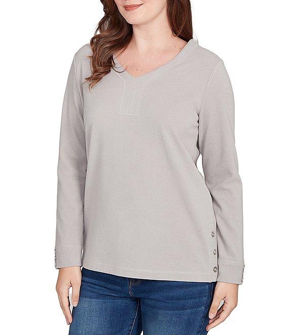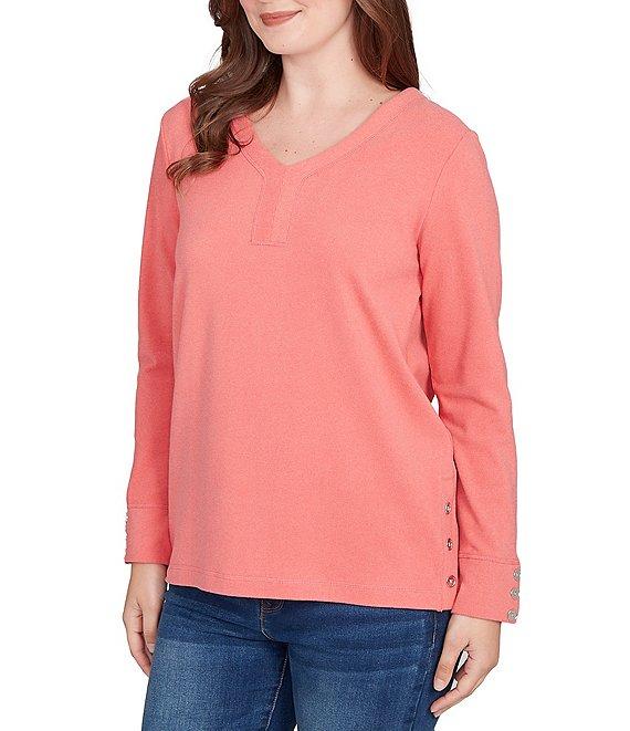 From Ruby Rd. Petite, this top features: Luxe rib knit fabrication V-neckline 3/4 sleeves Relaxed fit Button details at the hem and cuffs Pullover construction Polyester/spandex Machine wash/tumble dry Imported. A flattering v-neckline and luxe rib texture define this soft knit top, finished with dainty button details at the hem and cuffs. Long sleeves and a tailored silhouette make it a wardrobe favorite.