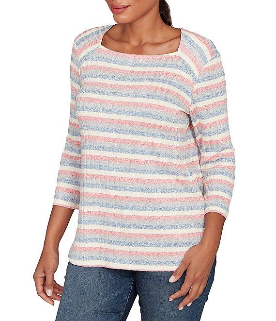 Ruby Rd. Petite Size Marled Stripe Ribbed Knit Square Neck 3/4 Sleeve Top