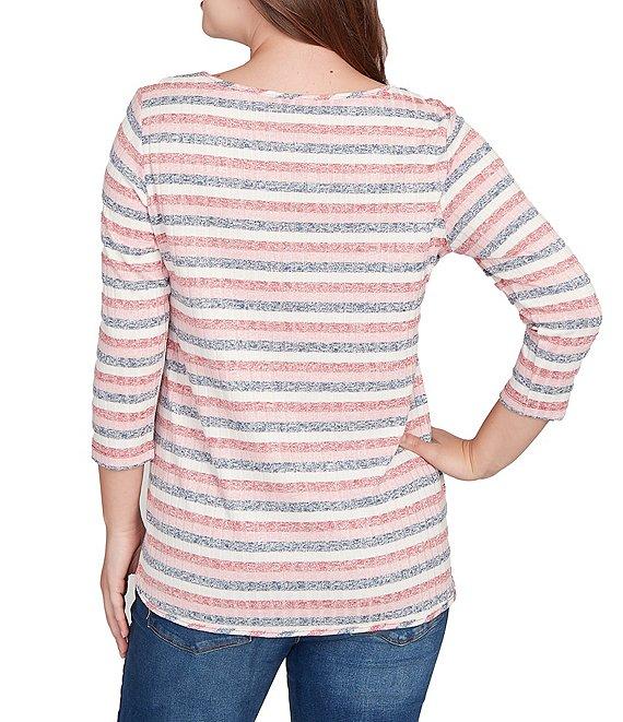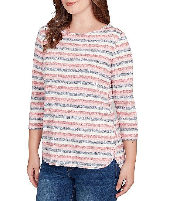 From Ruby Rd. Petite, this top features: Ribbed knit fabrication Boat neckline 3/4 sleeves Stripe print Curved shirttail hem Pullover construction Rayon/polyester/spandex Machine wash/lay flat to dry Imported. This ballet neck top features a marled stripe pattern on ribbed knit fabric for a textured twist on a classic. The curved shirttail hem and long sleeves keep it laid-back, while the slim stripe and flattering fit make it a go-to for casual days with style.