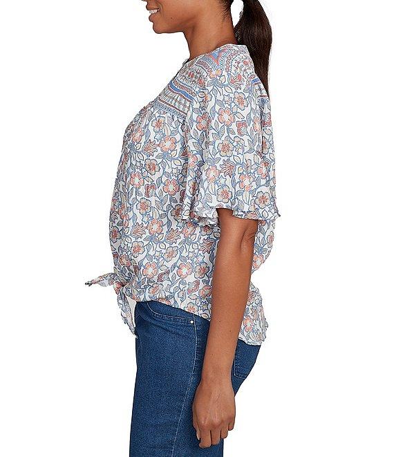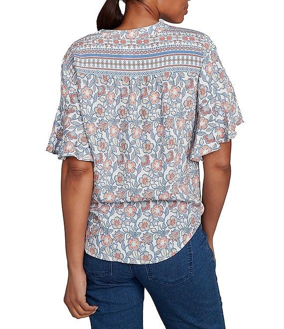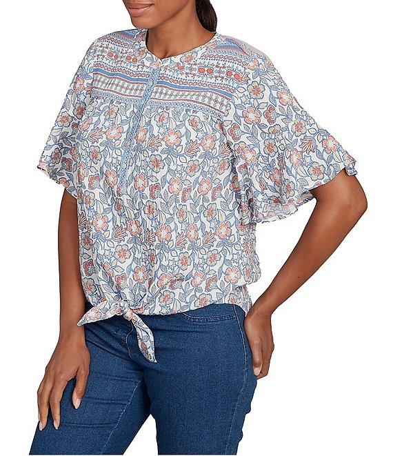 From Ruby Rd. Petite, this top features: Silky voile fabrication Round neckline Short flutter sleeves Sarasa floral border print Tie-front hemline Pullover construction Rayon/nylon Machine wash Imported. Add a touch of feminine charm to your wardrobe with this silky voile top. The unique Sarasa floral border print creates a captivating visual appeal. The henley neckline adds a casual touch, while the tie front detail enhances the silhouette. Crafted from lightweight voile, this top offers a luxurious feel and a comfortable fit.