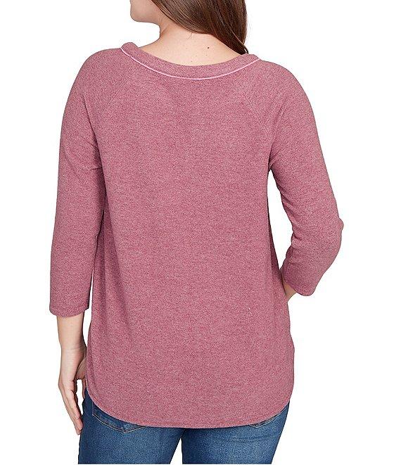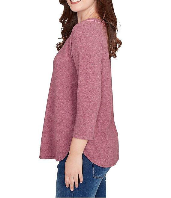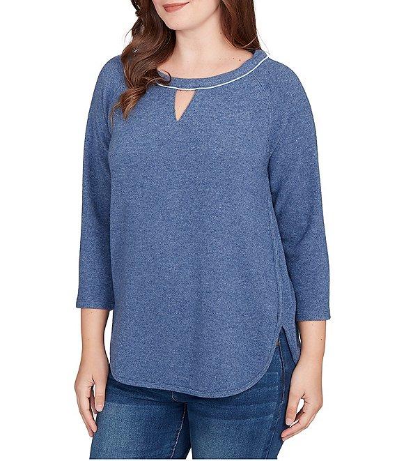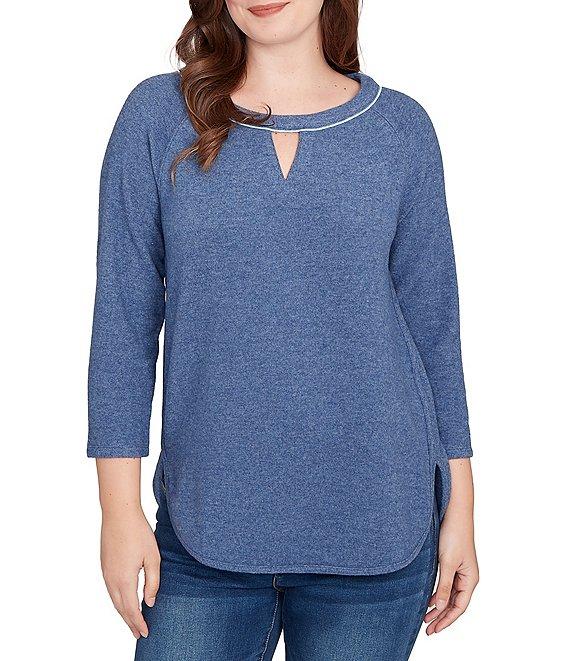 From Ruby Rd. Petite, this top features: Soft hatchi knit fabrication Keyhole neckline 3/4 sleeves Curved hemline Pullover construction Polyester/rayon/spandex Machine wash/line dry Imported. Casual, but make it cute. This soft Hatchi knit top pairs cozy heathered fabric with contrast tipping for just the right pop. The scoop neck, keyhole detail, and 3/4 sleeves strike that perfect balance of easy and elevated.