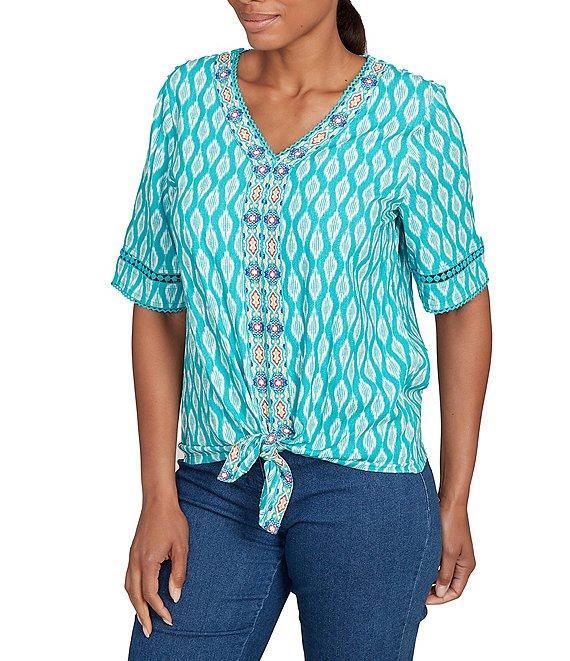 From Ruby Rd. Petite, this top features: Soft linen crepe fabrication V-neckline Short sleeves Geometric print Tie-front hem Pullover construction Rayon/linen Machine wash cold/line dry Imported. Experience the lightweight comfort of our printed soft linen crepe top. The eye-catching geometric print adds a modern touch, while the V-neckline and tie-front detail create a flattering silhouette. Short sleeves with a delicate textured edge complete the look, offering a blend of style and ease.